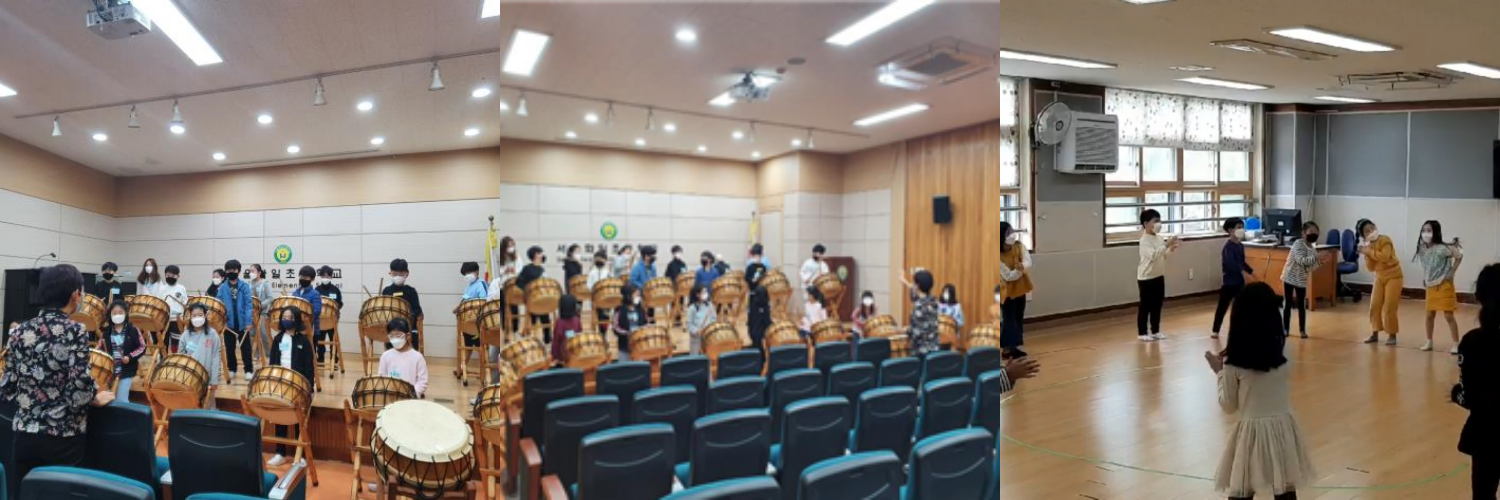 서울화일초등학교(교장 현연옥)에서는 올해 학교 특색사업으로 문예체 교육(무용 및 국악)을 실시하고 있습니다. 아르떼(무용)수업은 1~2학기 동안 1~4학년을 대상으로 실시합니다. 1~2학년 은 신체 조절, 움직임 기술, 전래놀이, 민속 무용 등을 공부하고 3~4학년은 속도, 모방, 시간, 공간성 표현 및 미국 민속 무용을 공부할 예정입니다. 국악교육은 전 학년을 대상으로 하며 1~2학년은 소고, 3~4학년은 모둠북, 5~6학년은 장구 및 풍물놀이 교육을 받게 됩니다. 처음에 학생들은 ‘국악’에 대해 낯설게 느끼고 어려워하기도 하였으나 다양한 활동을 통해 국악기를 직접 연주하며 즐겁게 국악 공부를 하고 있습니다. 특히, 학교 내 집단 감염을 예방하기 위해 ‘생활 속 거리두기’ 및 교육부 지침에 따라 개인위생수칙을 잘 지키고 거리두기를 하는 등 생활방역을 실천하며 진행하고 있습니다. 이번 문예체 특색 사업을 통하여 우리 화일 어린이들이 다양한 신체 표현을 배우며 표현력과 자신감을 기르고 우리 음악의 멋과 아름다움을 느끼며 국악과 조금 더 친숙해지는 기회를 갖게 되기를 바랍니다.