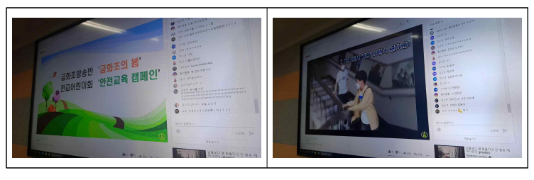 금화초 전교어린이회 임원 3명(장○○‧이○○‧이○○)과 학급임원 2명(이○○‧최○○)이 협력하여 제작한 ‘안전캠페인 영상’이 금화초 어린이날 기념 방송조회(5/4, 화)에서 상영되어 학생‧학부모로부터 큰 호응을 받았다.