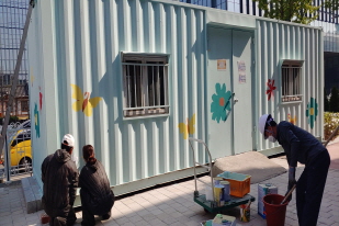 서울가곡초등학교[교장 이태구]에서는 4월에 뒤뜰 창고 및 에코스쿨 의자, 운동장 원형의자 등을 여러 날에 걸쳐서 페인팅 작업을 하였습니다. 회색의 칙칙한 창고는 교장선생님 이하 연구부장님 시설주무관님의 노고로 재탄생하였습니다. 회색의 재활용 창고는 민트색 바탕을 칠한 후 꽃과 나비