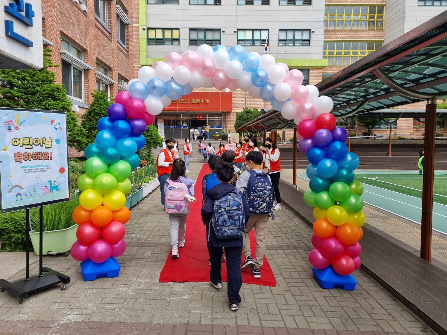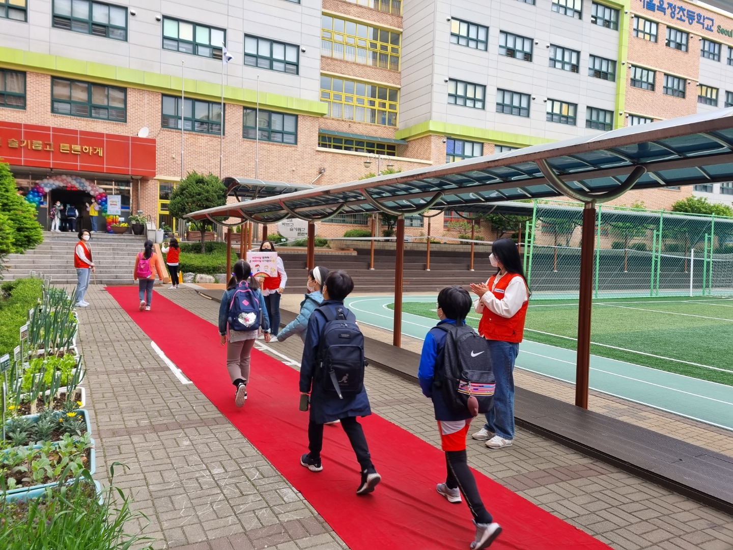 서울옥정초등학교(교장 이근실)에서는 어린이날을 기념하여 학부모회 주관 교문맞이 레드카펫 행사를 4월 29일(목)~4월 30일(금)까지 이틀간 진행하였습니다. 옥정초등학교 학부모 10여명은 오전 8시 30분부터 9시까지 정문부터 학교 건물 입구까지 깔린 레드카펫 좌우에 서서, "화이팅", "어린이 날을 축하해요" 등의 구호를 외치며 등교하는 800여명의 어린이들을 한명 한명 맞이 하였습니다. 저학년부터 훌쩍 키가 큰 고학년까지 옥정초등학교의 모든 학생들은 박수갈채와 환호를 받으며 씩씩한 발걸음으로 레드카펫을 행진 하였습니다. 세계로! 미래로! 힘차게 도약하는 미래의 주인공으로 자라나기를 기대해봅니다.