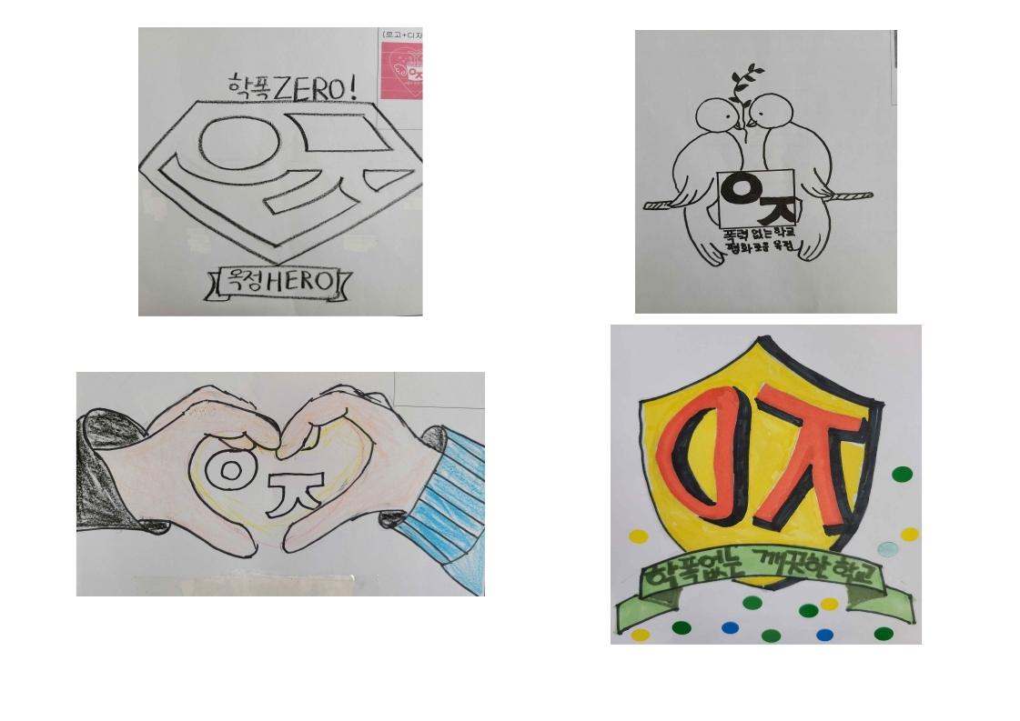 5, 6학년은 학교폭력예방 캠페인과 관련해 티셔츠에 들어갈 로고와 문구를 직접 디자인 하며 학교폭력 예방을 위한 시간을 가졌습니다. 그리고 5, 6학년 학생들 작품 중 후보작품을 선정하고 이 4개의 후보 작품 중 서울옥정초의 모든 학생들이 1인 1투표를 하여 제일 많은 표를 받은 디자인이 학년별 티셔츠 로고로 선정되었습니다.