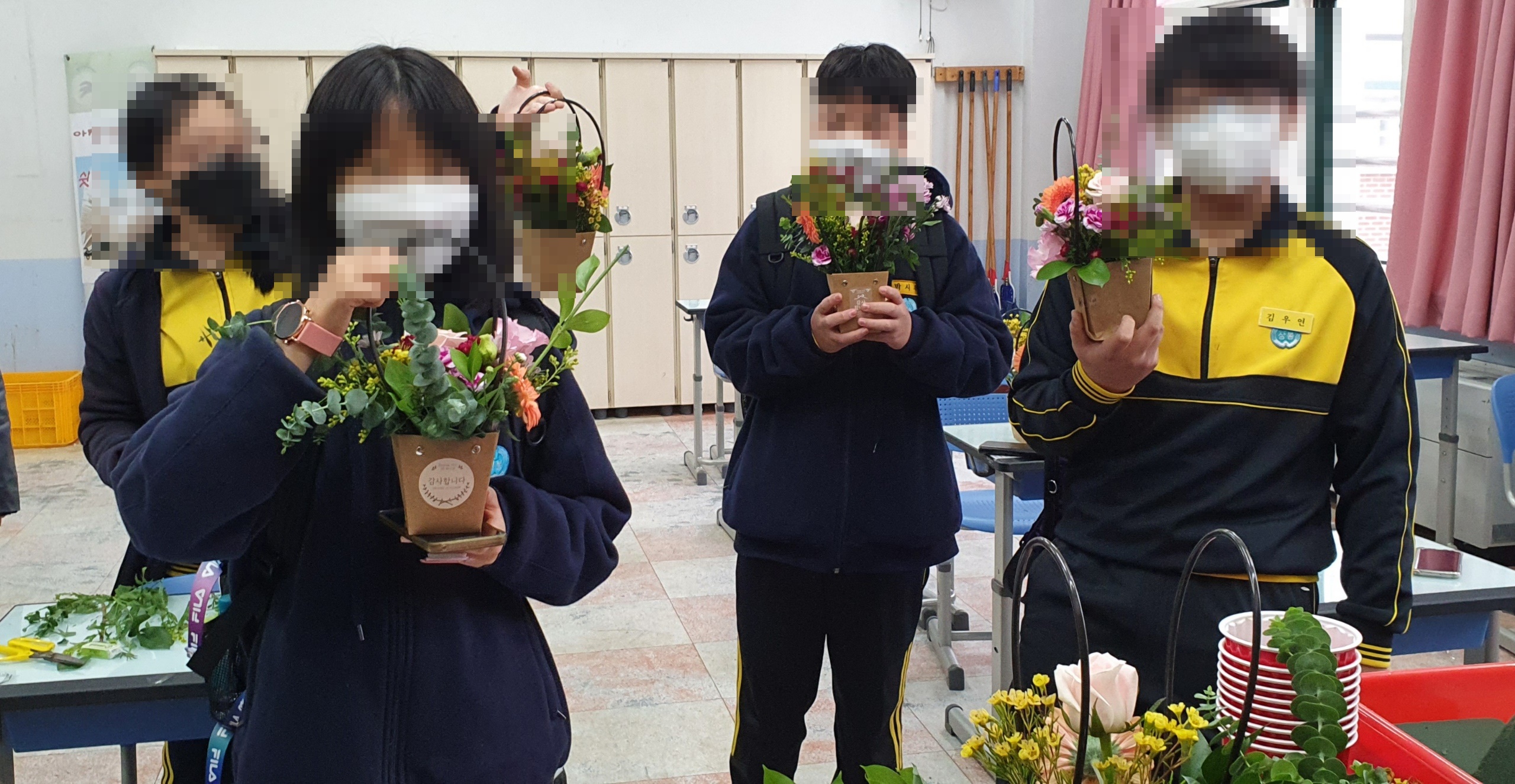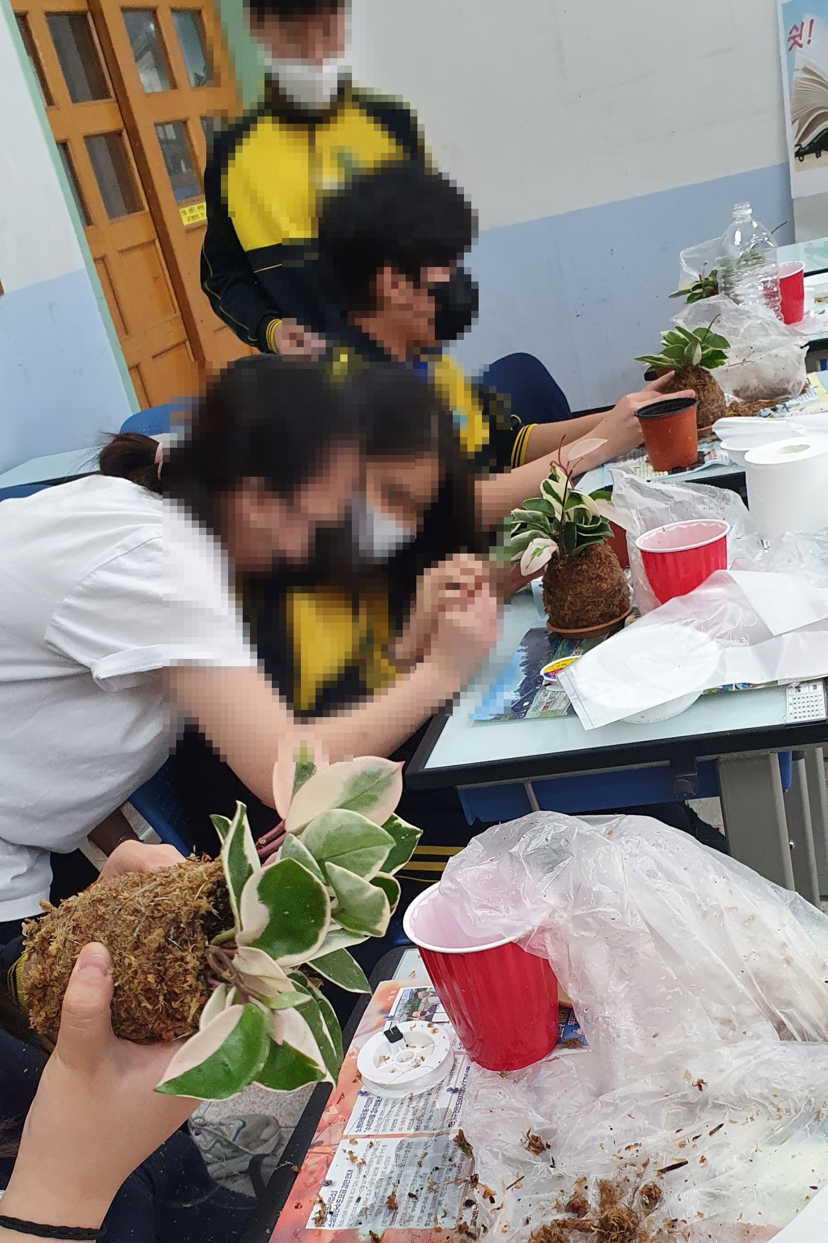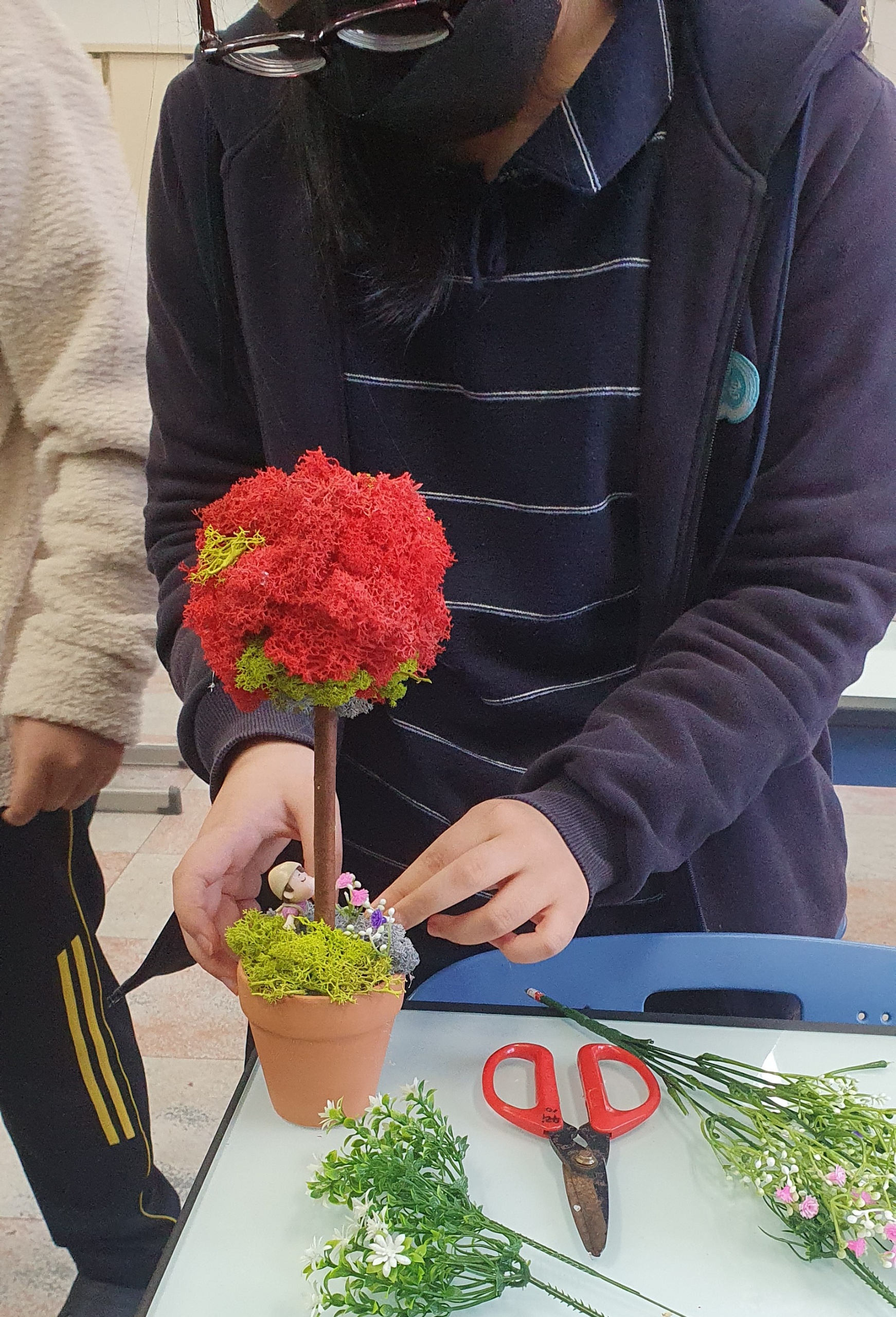 □ 이 원예치료 프로그램은 1학년 학생 10명을 대상으로 ‘나를 위한 선물’(꽃바구니), ‘소중한 나만의 색감’(다육기 테라리움), ‘친구의 의미’(호야 토피리어 만들기), ‘아낌없이 주는 나무’(스칸디아 모스 나무 만들기)를 주제로 진행되었다.