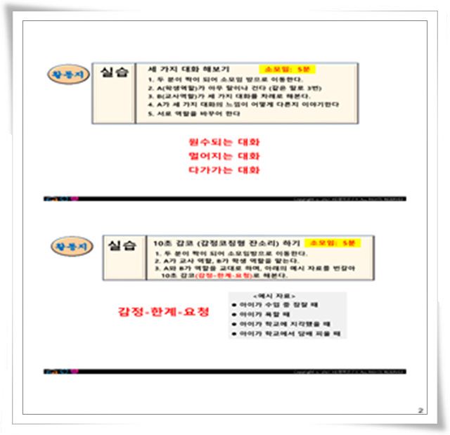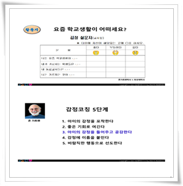 비록 비대면 연수이지만 교사 간 다양한 역할극을 통해 감정 공감의 중요성을 알게 되었다. 연수에 참석한 교사는 ‘강사님의 뛰어난 강의력과 실습 기회로 짧게나마 감정코칭 방법을 체득할 수 있는 소중한 시간이었다. 이후 대면 연수를 통해 감정코칭 기법을 좀 더 알고 싶다’고 소감을 밝혔다. 감정코칭 연수를 계기로 앞으로 소통과 공감이 더욱 살아 숨 쉬는 학교 공동체 문화가 자리잡기를 기대한다.