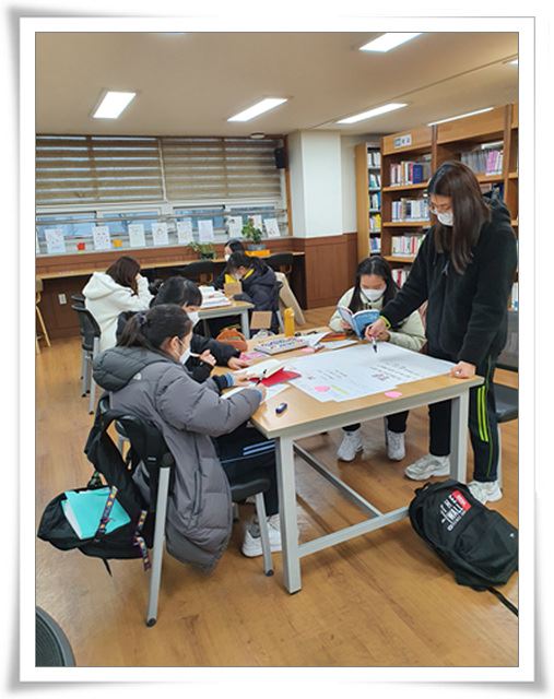 이틀째인 23일(화)에는 ‘PMI’와 ‘질문하기’를 활용한 독서 토론이 이루어졌다. 모둠별로 인물의 P(Plus), M(Minus), I(Interesting)에 대한 의견을 나누고, 책에 대한 질문을 점점 확장시켜 우리의 삶과 연결해보는 활동이다. 이를 통해 학생들은 다양한 의견을 나누며 깊이 있는 책읽기를 경험하였다.