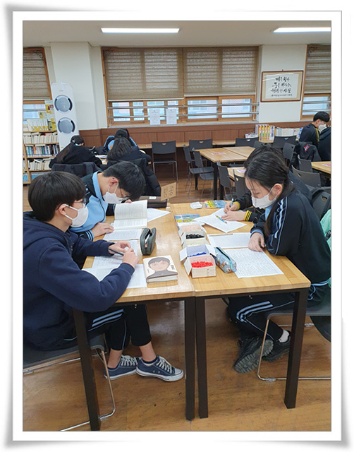 송례중학교(교장 인치종)에서는 2021년 11월 22일(월)부터 24일(수)까지 2021학년도 독서캠프 ‘북마크송례 – BOOk 속에서 마음이 크는 송례’를 운영하였다. 방과후 시간에 도서실에서 열린 이번 독서캠프에서는 ‘시간을 파는 상점’과 ‘아몬드’, 두 권의 책을 주제로 다양한 독후활동을 하였다.