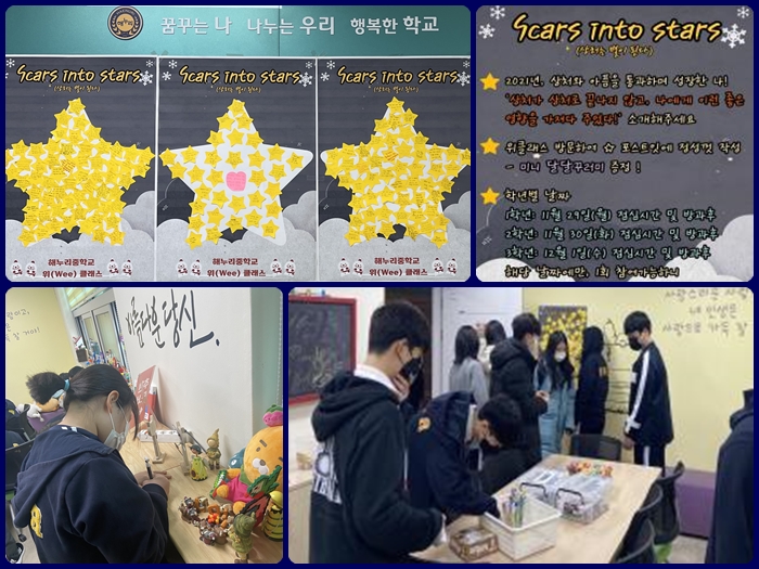 ‘Scars into stars’ (상처는 별이 된다)라는 주제로 진행된 이번 위(Wee)클래스 행사는 학생들이 자신이 겪은 상처와 아픔이 아픔으로만 끝나지 않고, 오히려 나를 성장시키고 단단하게 만드는 소중한 삶의 재료가 되었음을 스스로 발견하고 함께 나누는 의미로 마련되었습니다. 많은 학생들이 참여하여 올 한 해를 돌아보고 자신이 경험한 일들의 의미를 스스로 떠올려보는 과정을 통해 자신을 칭찬하고 자존감을 얻을 수 있었습니다. 다른 친구들의 경험도 함께 보면서 연대감을 느낄 수 있었고 서로에게 보이지 않는 위로를 건네는 시간이 되었습니다.