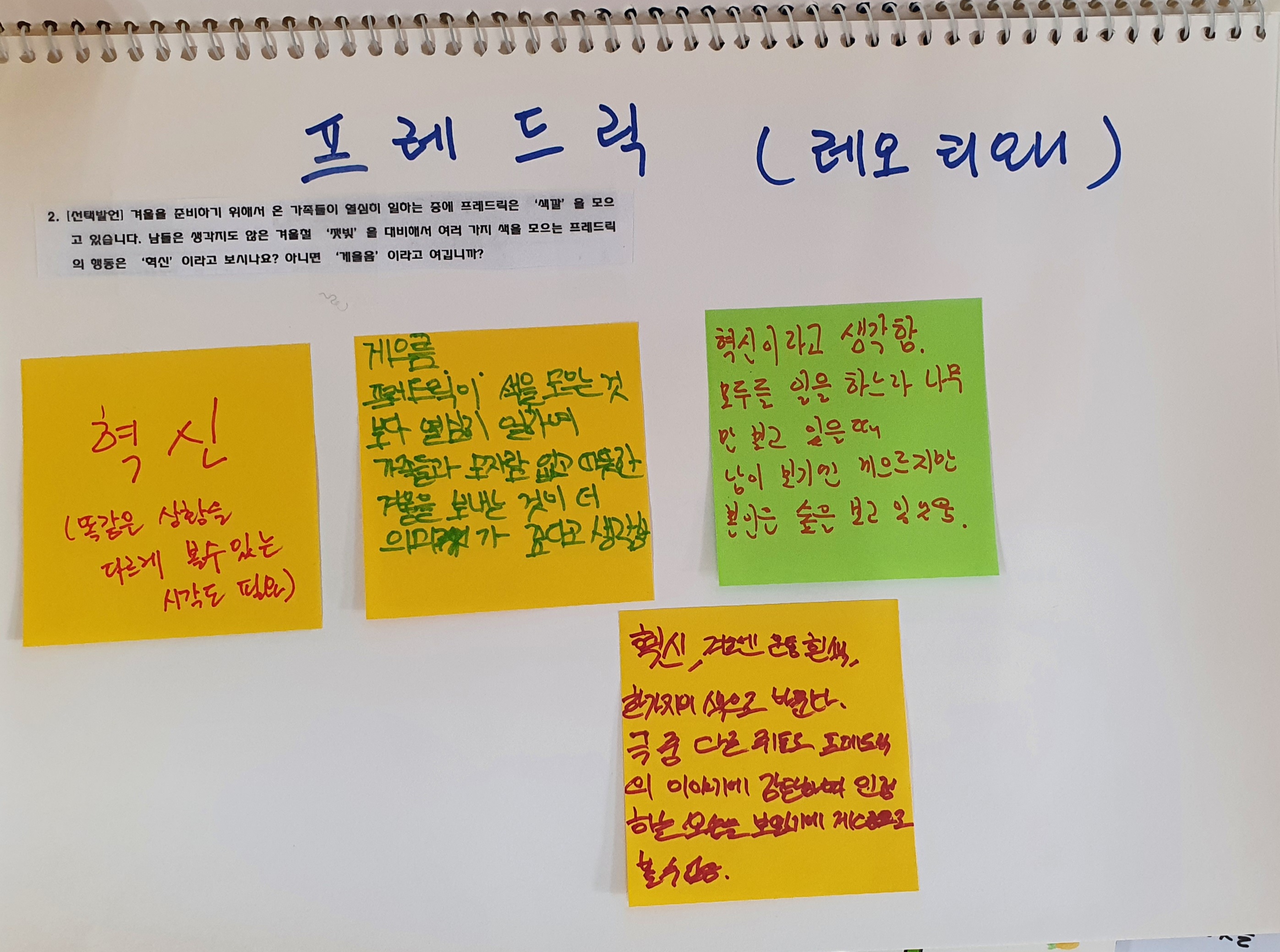 □ ▷ 릴레이로 독감을 쓰기 ▷ 릴레이로 책 주인공에게 편지 쓰기 ▷ 함께 독후 감상 그림 그리기 ▷함께 책 소개 포스터 그리기 ▷ 함께 독후 감상 노래 만들어 부르기 ▷ 함께 책 소개 광고 영상 만들기 ▷ 함께 독서 생활 브이로그 그리기 등을 선택하여 활동을 하였다.
