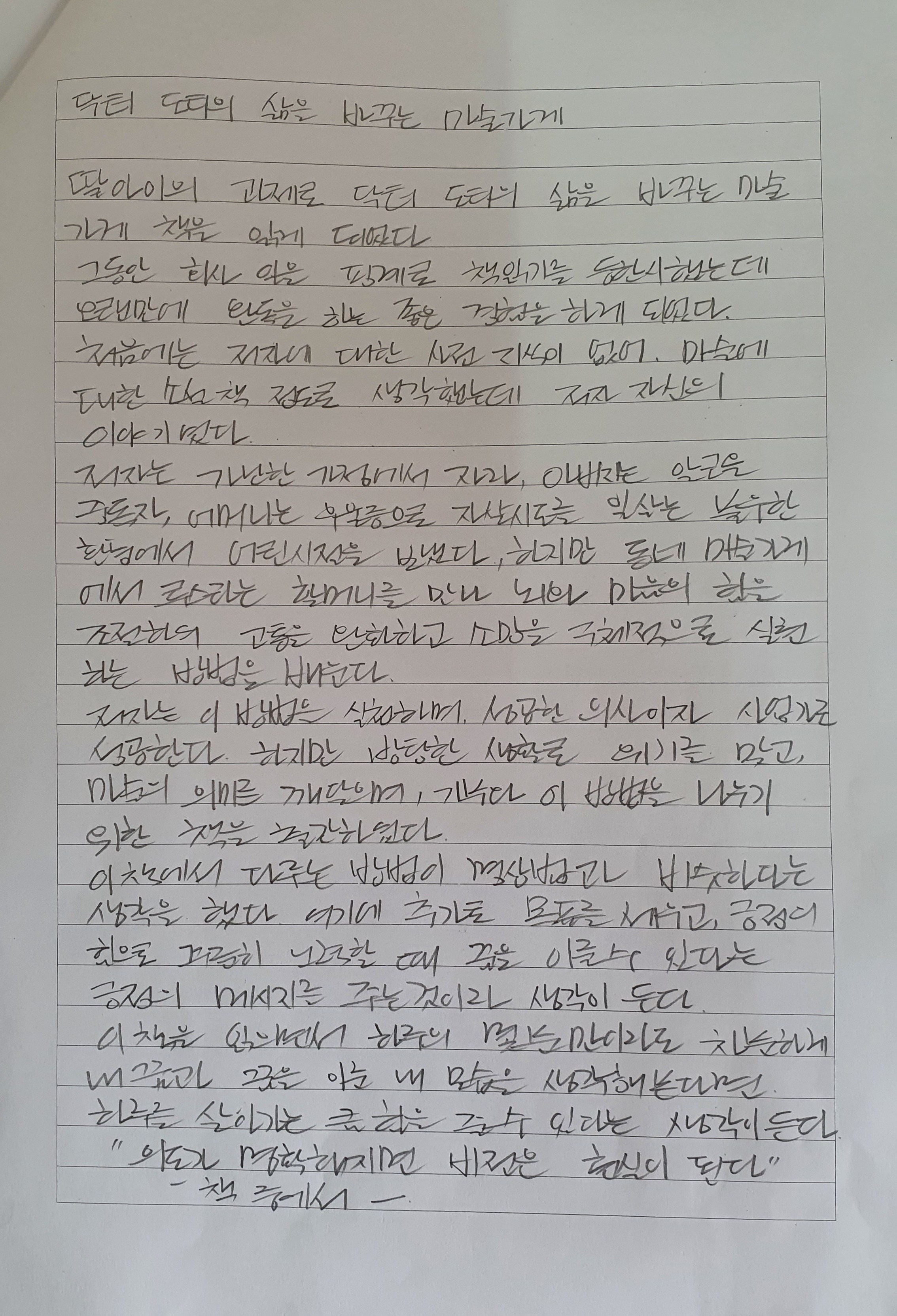 □ 책을 1권 자유롭게 정하고 두 달간 독서를 하고 독후 활동을 하는데 「달러구트 꿈 백화점」 「닥터 도티의 삶을 바꾸는 마술세계」 「프레드릭」 「나의 라임 오랜지 나무」 「당나귀는 당나귀 답게」를 선택하여 독서를 한 후에