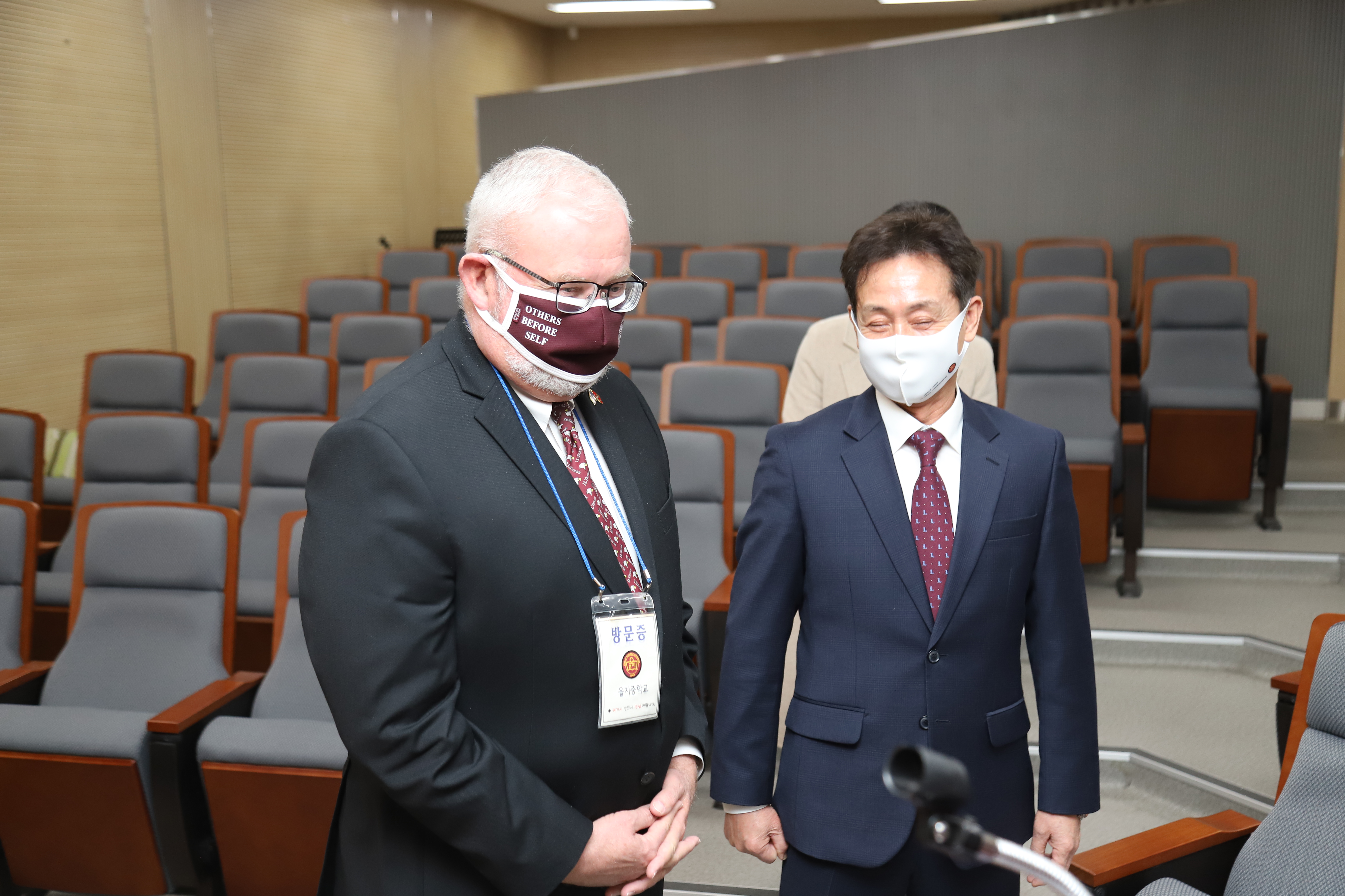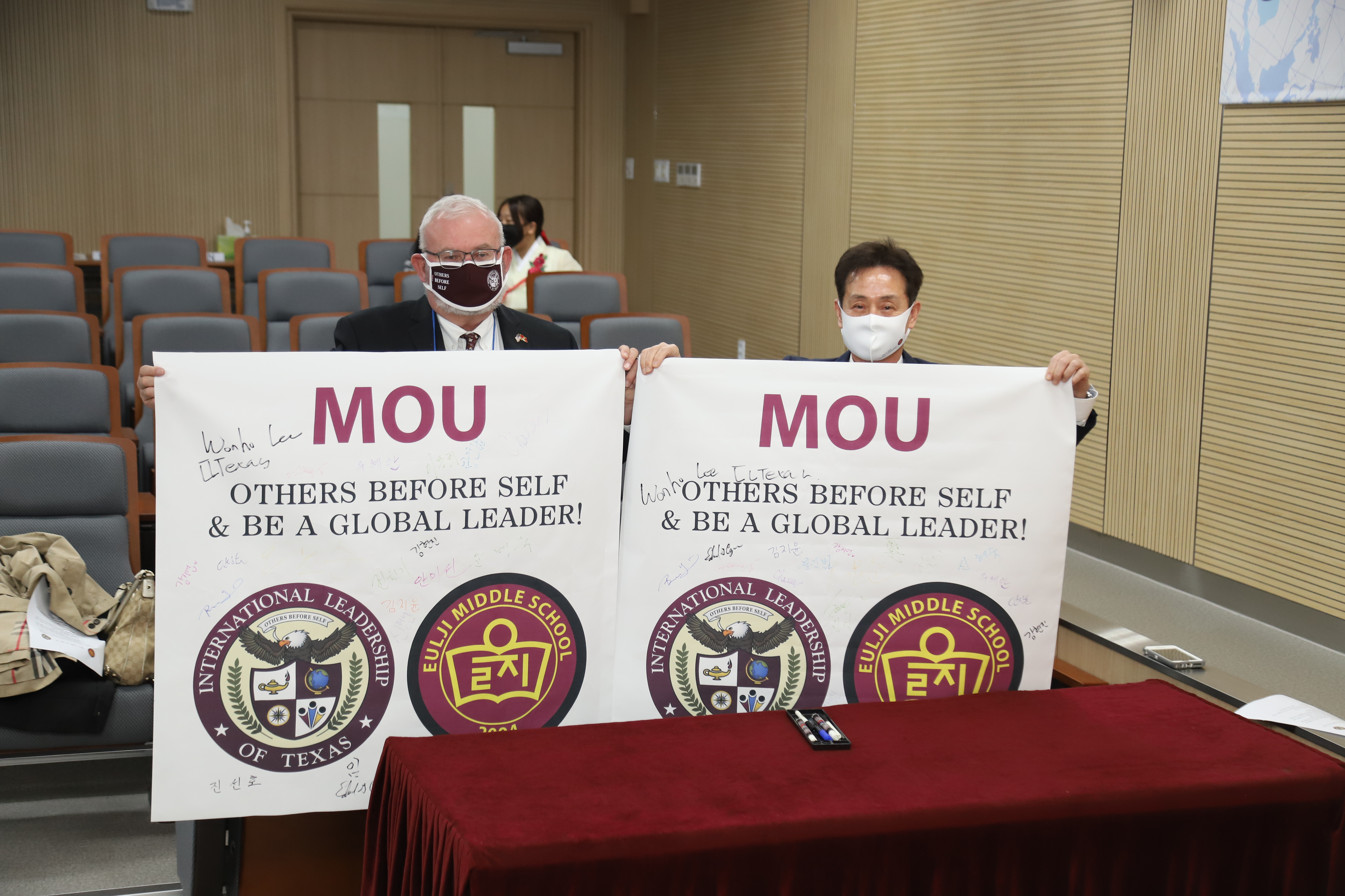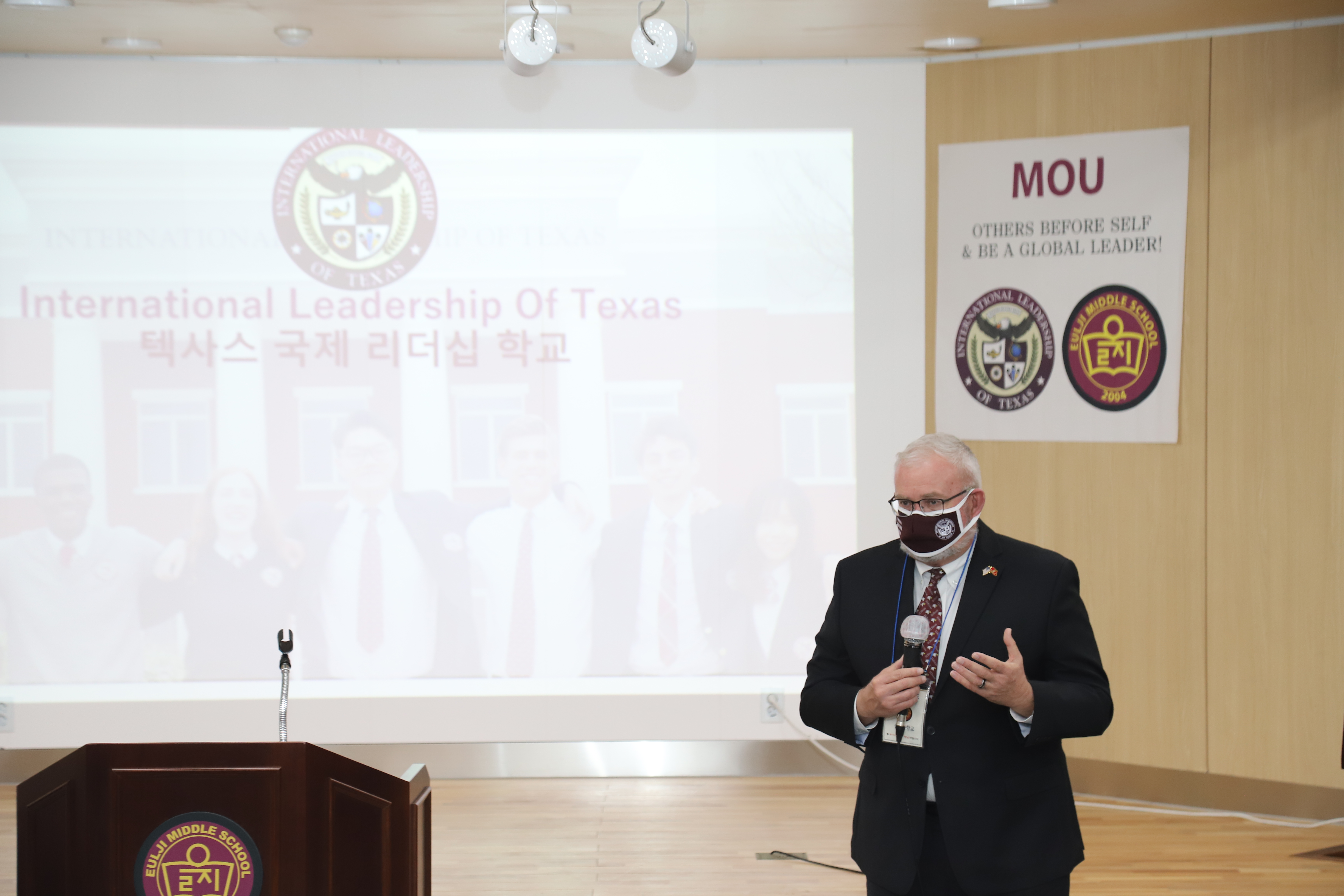 □ ILTEXAS와의 협약식은 본교 소강당에서 오전 11 시에 실시되었으며 오프닝 공연으로 2학년 신○인 학생의 가야금 연주가 있었으며, 양측 대표님들의 인사말씀으로 시작이 되었다. ILTEXAS CEO Mr. Conger는 해군에 20년간 근무하며 한국을 여러 번 방문하며 한국을 좋아하게 되었다고 하였고 본교 교장선생님 역시 해군 복무 경험이 있어 반가운 공감대 가 형성되기도 하였다. 미국 학생들은 본인이 나고 자란 지역사회에서 생활하는 것이 대부분이어서 미국 학생들이 세계를 알아가는 것을 교육의 목표로 ILTEXAS는 2012년도 학교 설립되었으며 현재 20,500명 학생 규모의 재단이 되었으며, 미국 선생님들뿐만 아니라 100명의 중국 선생님, 100명의 스페인 선생님, 국제학생들과 공부하며 다양한 언어와 문화를 미국과 공유하고 함께 배울 수 있는 기회를 마련하고 있으며 을지중학교의 초청에 감사하며 한국의 선생님들이 학생들을 열정적으로 가르치는 모습에 감동을 받았다고 전했다. 협약식에 참가한 학부모님들과 본교 교원, 학생들이 모두 협약 국기에 서명을 하고 협약국기 교환을 마지막으로 협약식을 마무리 하였으며 교장실에서 외빈 선물로 마련한 한국 전통 문화 공예품 증정 및 ILTEXAS 의 MOU 감사패와 학교 교복 가디건을 본교 교장선생님께 선물하였으며 ZOOM 온라인 협약식 사전 준비회의때 부터 한국의 학교 급식을 꼭 체험해 보고 싶다는 미국 측의 요청으로 본교 학생식당에서 점심식사를 함께하며 협약식을 마쳤다.