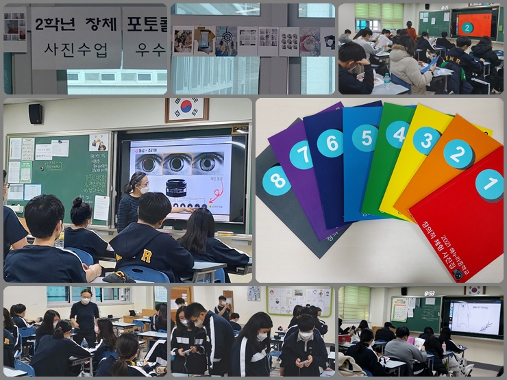 2학년들은 2021년 1년간 예술강사(아르떼) 지원을 받아 창체(진로) 수업으로 사진 수업을 실시했습니다. 매주 한 시간씩 사진의 원리, 셔터 스피드 및 노출을 활용한 사진 기법, 결정학적 균형 등의 조형 원리, 포토몽타주 표현 등을 배우고 국내외 현대 사진 작가와 그들의 작품을 감상했습니다. 또한, 나의 페르소나 찾기, 코로나와 뉴노멀 표현하기, 사회문제에 대한 비판적 사고 하기, 창의적 발상을 위한 알파벳 프로젝트 등 다양한 주제의 사진을 촬영하고 자신의 촬영 의도를 발표했습니다.