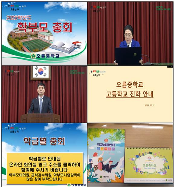 오륜중(교장 백형훈)에서는 3월 21일에‘학부모 총회’를 개최하였다. 총회 전 학교교육활동 전반에 대한 내용이 담긴 안내 책자와 학사력을 배부하여 학교 생활의 이해를 도왔다. 코로나19로 인해 온라인 실시간방송으로 학부모 총회를 열어 학교교육활동 전반을 소개하고 이어서 학부모를 대상으로 선행학습 유발 금지, 불법찬조금 및 촌지 관행 근절, 청탁금지법 안내, 학교폭력 예방교육, 성폭력 예방교육, 아동학대 예방교육, 학생 자살예방교육, 다문화 이해 교육 등의 내용으로 학부모 연수를 실시하였다.
