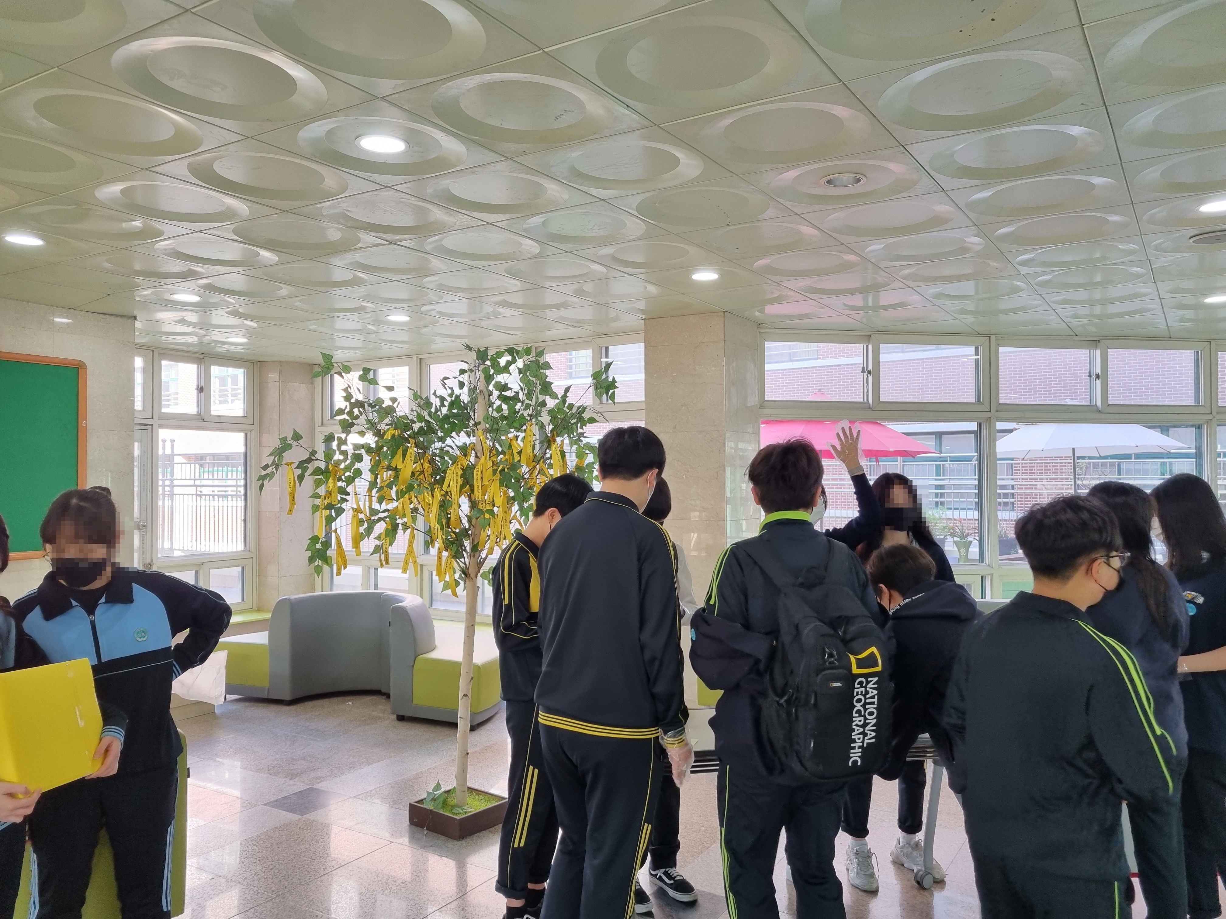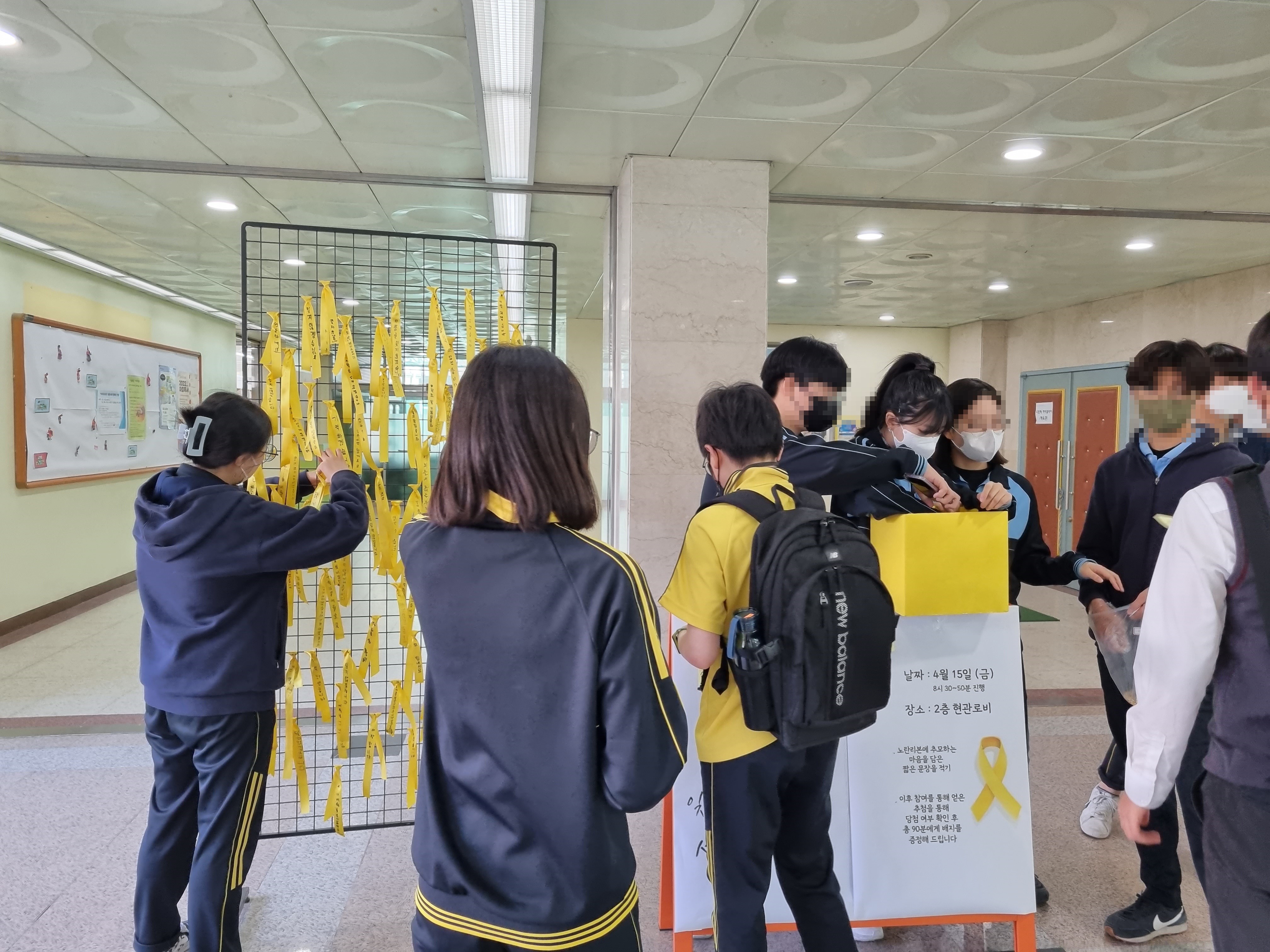 □ 전교생이 아침 등교시간에 세월호 기억 문구 쓰기 행사에 자발적으로 참여하였다.