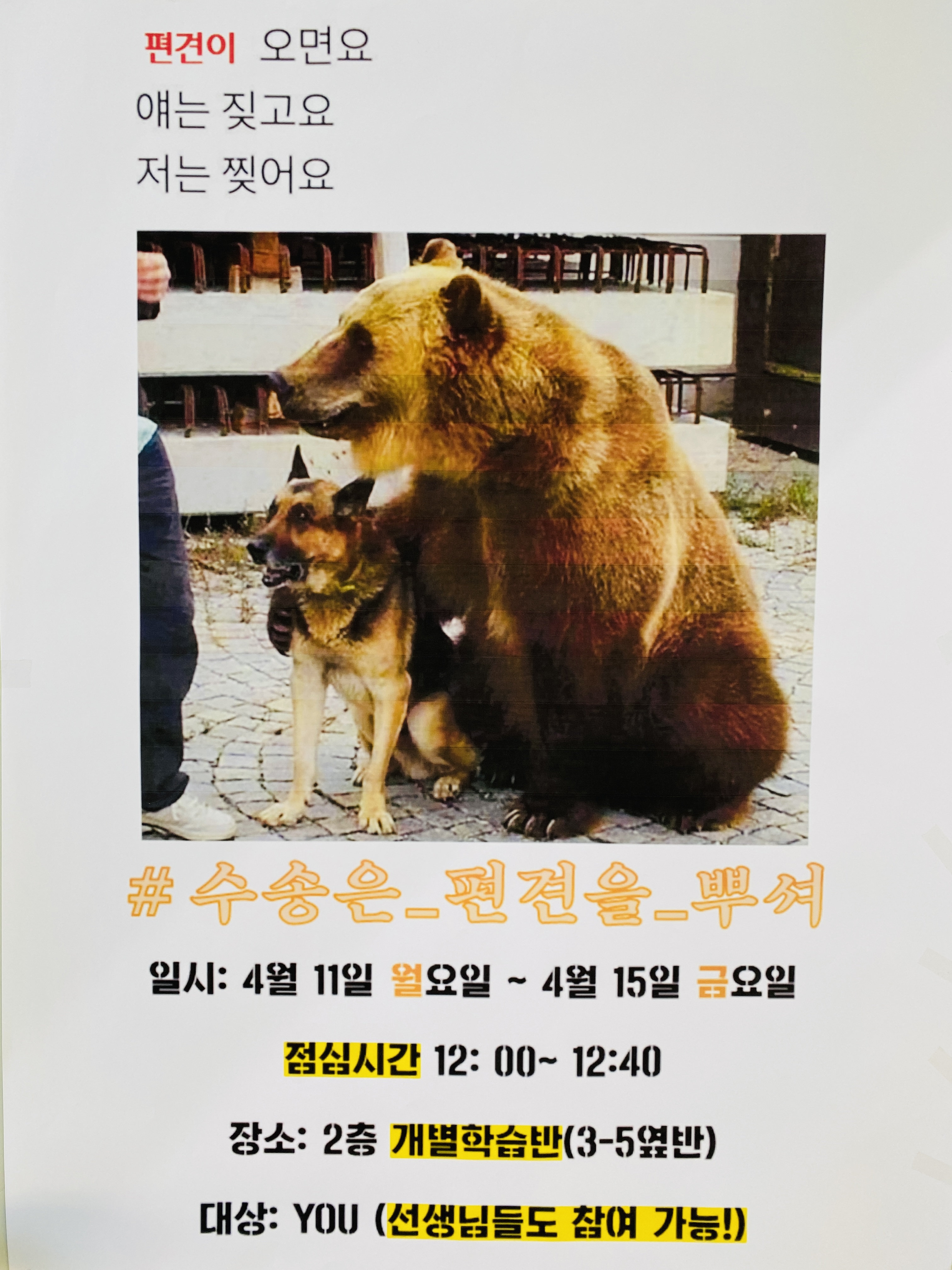 학교 곳곳에는 우리 수송이들의 눈길을 끄는 포스터들이 부착되었답니다~