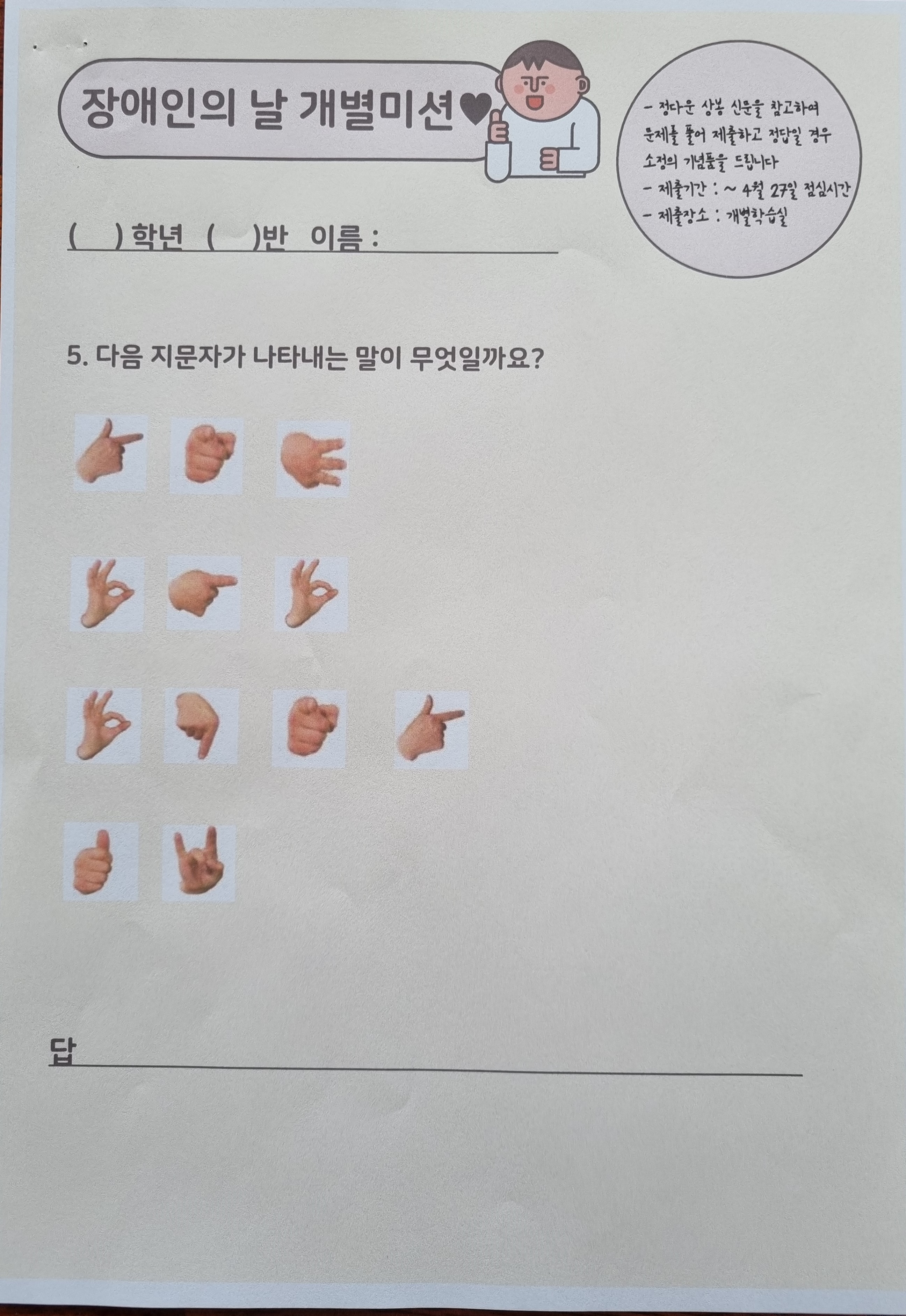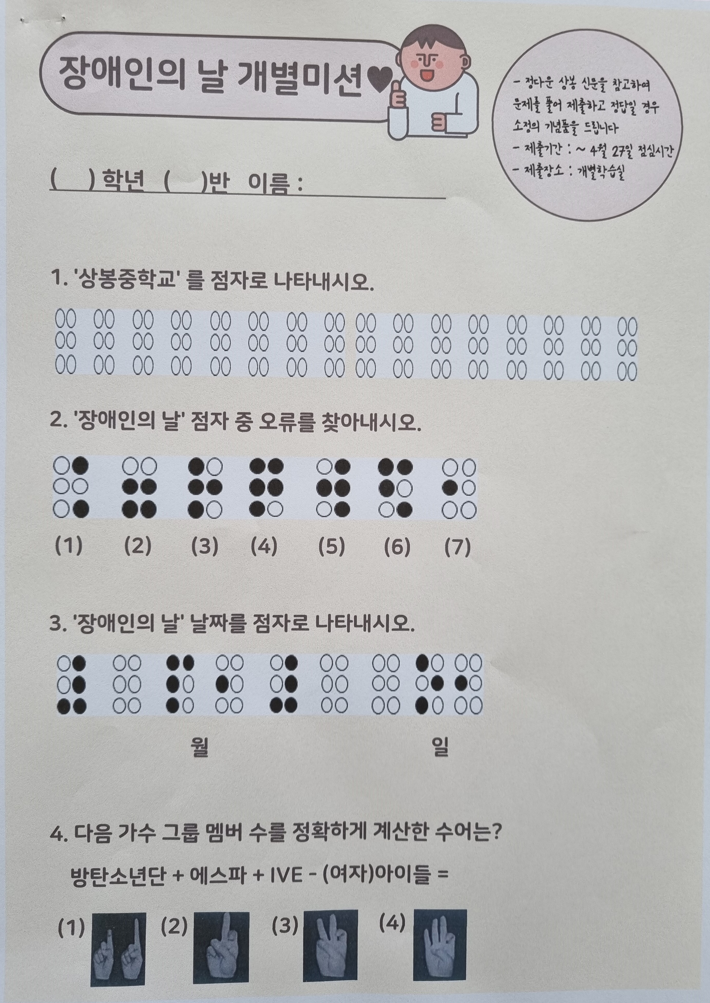 □ 한편 개인별 미션 대회를 열어 입상자에게는 기념품을 제공하는 등의 참여열기를 끌어 올리려 하였는데, ▷ 점자 나타내기, 점자 오류 찾기 ▷ 수어가 나타내는 말 맞추기▷ 가수 방탄소년단 + 에스파 + IVE + (여자)아이들의 멤버수를 계산하여 수어 맞추기 등을 행하였다.