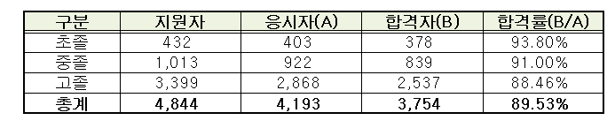 ▢ 금년도 제1회 검정고시는 4,193명이 응시하여 3,754명이 합격하였으며 합격률은 89.53%를 보였다.