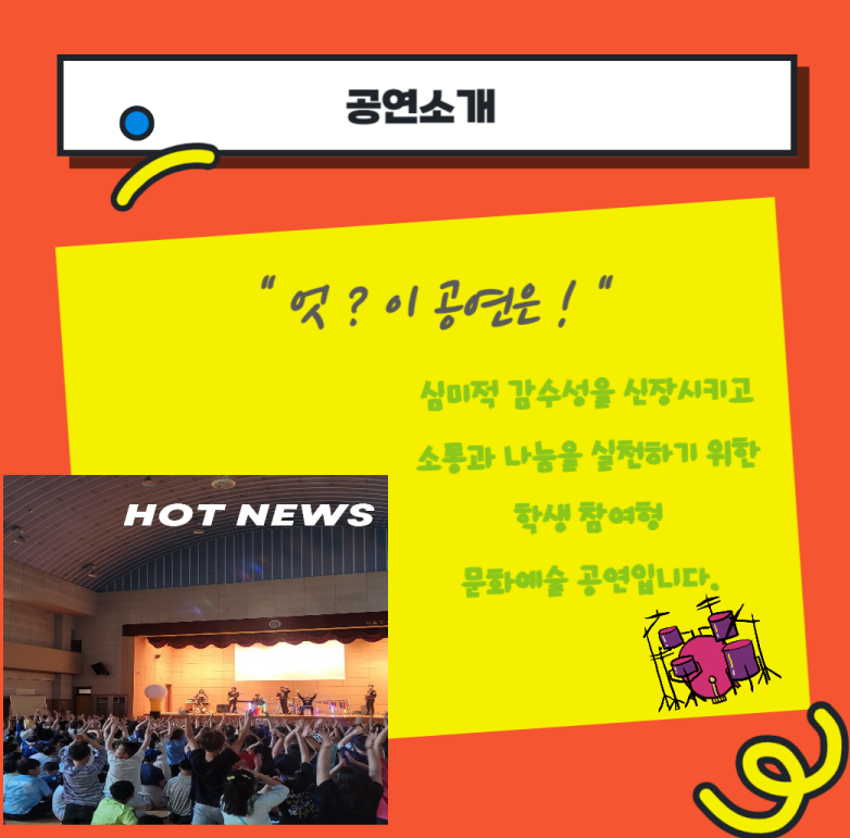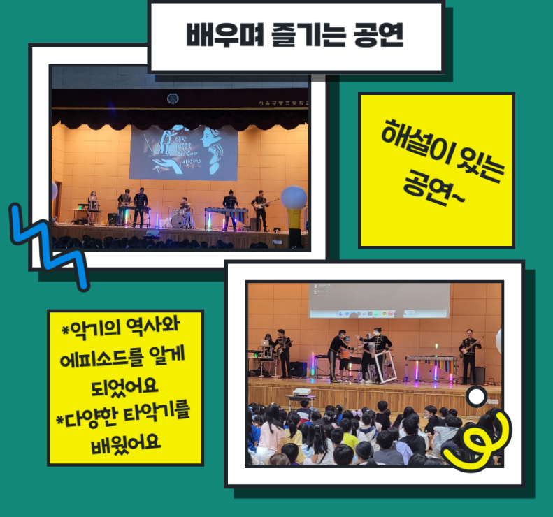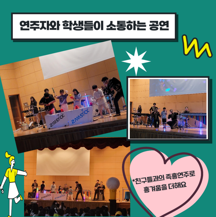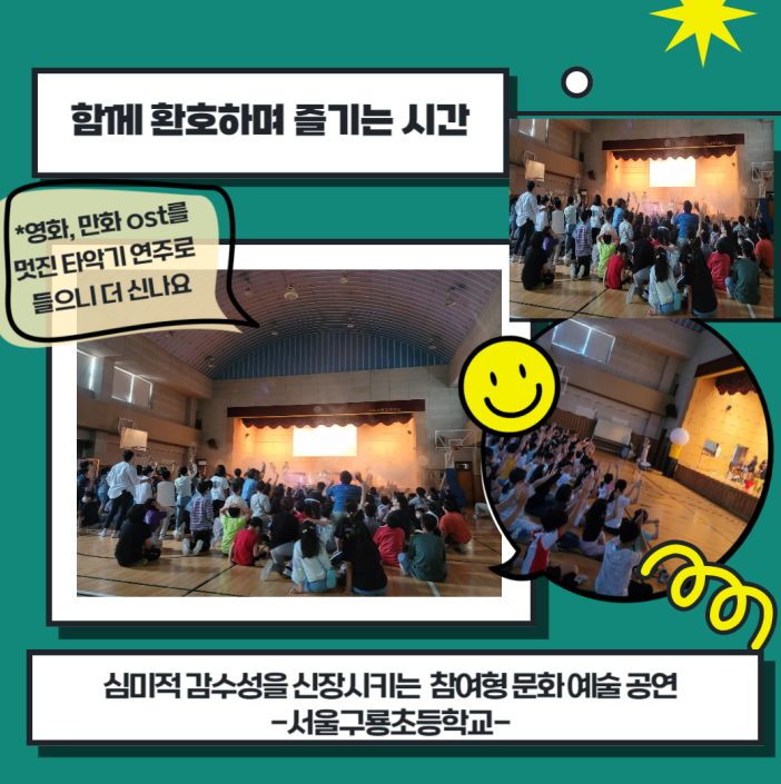 초등예술하나 프로그램은 아이들이 평소 접해 보지 못했던 타악기 참여형 공연(제목: 다이나믹 콘서트)-잼스틱이었으며, 공연 내용은 지구의 환경을 생각하는 재활용악기 연주 등으로 신나는 문화예술공연을 접할 수 있었던 좋은 경험이었습니다.