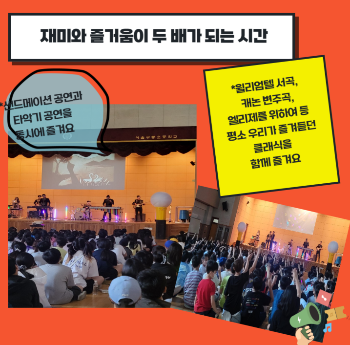 서울구룡초등학교(교장 소양호)는 2023 초등예술하나 문화예술공연을 전교생 대상으로 1,2부로 나누어 진행하였습니다. 공연장소는 서울구룡초학교 대강당에서1) 09:00~10:10(1회차 70분 공연) - 1,2,6학년 대상, 2) 10:30~11:40(2회차 70분 공연) - 3,4,5학년 대상으로 진행하였습니다.
