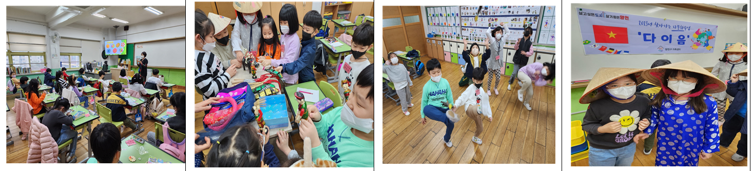 서울양강초등학교(교장 김수정)에서는 2학년은 4월 11일 양천구 가족센터에서 진행하는 다문화 교육을 실시하였습니다. 여러 나라의 문화를 배우고, 오늘날 다문화 감수성 향상을 위한 찾아가는 다문화 수업 ‘다이음’ 프로그램을 통해 각 나라의 고유한 의식주 문화와 다양성을 배울 수 있었습니다. 1, 2반은 베트남의 역사와 문화를 배우고, 베트남의 전통 의상도 입어보며 팽이와 제기와 같은 전통놀이를 즐겼습니다. 3, 4반은 중국의 자랑거리와 문화를 탐구하고, 전통 문화 이해를 위한 만들기 활동을 하였습니다. 이를 통해 2학년 어린이들은 우리와 다른 여러 나라들의 풍습과 문화를 이해하고 이를 존중하는 글로벌 인재의 소양을 기를 수 있었습니다.
