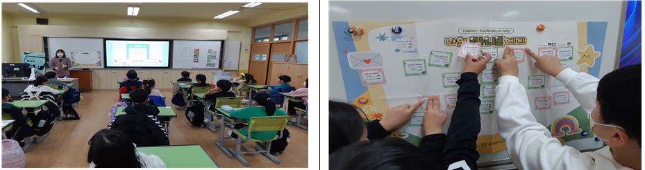 서울양강초등학교(교장 김수정)에서는 3학년 학생들은 굿네이버스에서 파견된 강미란 선생님과 함께 학교폭력예방교육 활동을 하였습니다. 친구들에게 괴롭힘과 따돌림을 당하는 달래를 도와주고 진정한 친구가 되어준 들판이의 모습을 영상을 통해 보면서 학교폭력은 절대로 일어나면 안 된다는 것을 깨달았습니다. 또 반 친구들을 위하여 존중과 배려를 실천하고, 친구의 마음을 알아주고 도와주는 마니또 친구가 되겠다고 다짐하였습니다.