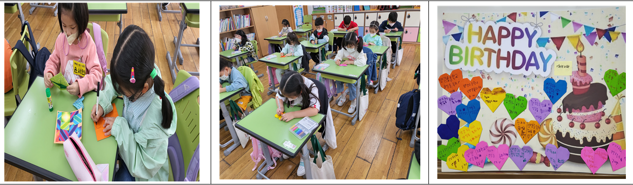 서울양강초등학교(교장 김수정)에서는 1학년 각반 교실에서는 개교를 기념하는 행사가 실시되었습니다. 교장 선생님께서 방송을 통해 학교에 대해 자세하고도 재미있는 이야기를 많이 해 주셨고 1학년 학생들은 학교에 대한 자랑스러운 마음과 축하하는 마음을 담아 또박또박 한 글자씩 편지를 쓰면서 축하였습니다. 또한 우리 모두 바르고 건강한 양강의 1학년으로 학교생활도 더 열심히 하겠다고 다짐해 보기도 했습니다. “양강초등학교야!! 생일 축하해!!”