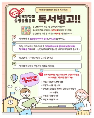 7월 10일(월)~7월 21일(금) 사이에 ‘골고루 독서!’ 를 위한 ‘십진분류 독서빙고'가 진행되고 있습니다.