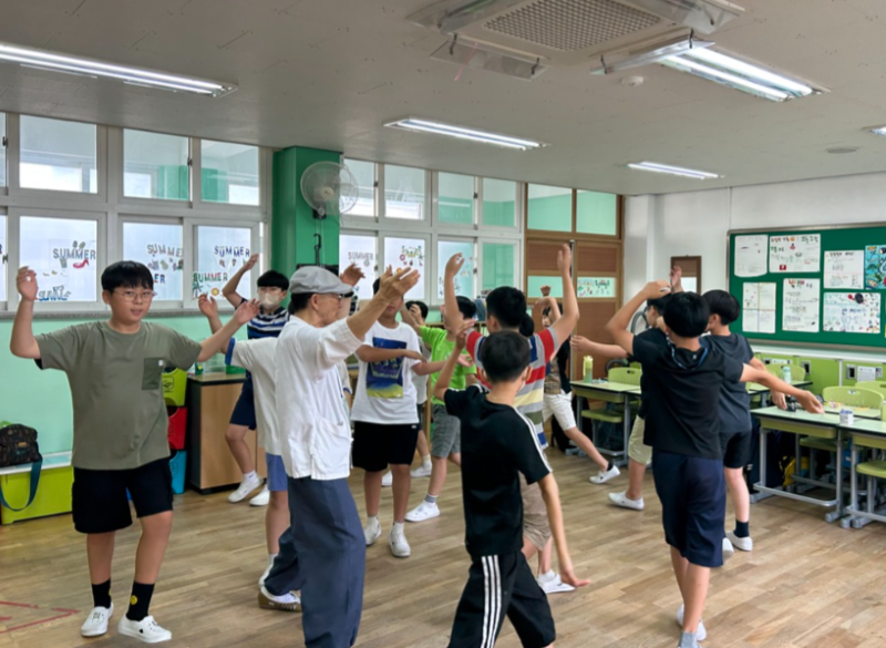 서울방산초등학교 4학년 학생들은 공연 전 2주 동안 매주 1시간씩 진행된 수업을 통해 송파산대놀이에 대해 배워보는 시간을 가졌습니다. 첫 시간에는 탈춤 지역 분포와 탈춤의 기본이라고 할 수 있는 장단, 불림을 익혔고, 두 번째 시간에는 건드렁, 여다지, 어깨치기와 같은 춤사위를 몸소 체험하며 송파산대놀이를 보다 깊이 이해할 수 있었습니다.