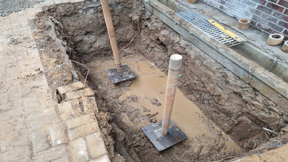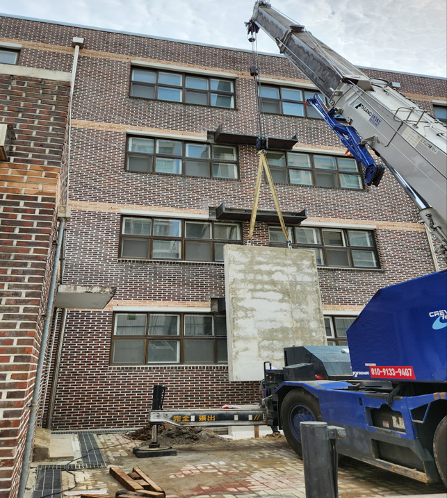 학교 건물 4개 소에 각각 지하 35m의 깊이로 굵은 철제 봉을 2개씩 박아 지지대를 삼은 후, 그 위에 커다란 기초 시멘트 구조물을 얹어 연결하는 작업을 실시하였습니다. 기초 시멘트 구조물 위에 3~4개의 PC 콘크리트 구조물을 차례대로 얹어 연결한 후 본 건물과 결합시켜 학교 건물을 튼튼하게 받쳐 줄 수 있도록 하였습니다.