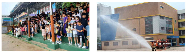 서울영풍초등학교(교장 민경일)에서는 7월 14일(금)에는 거여119안전센터와 함께하는 소방합동훈련이 있었습니다. 훈련은 화재 발생 시 신속한 119 신고와 인명 대피 훈련, 화재 예방을 위한 소방안전교육, 생활안전사고 예방 교육 등 실생활에서 일어날 수 있는 화재에 대한 예방과 대처 능력을 키우기 위한 내용들로 진행되었습니다. 이날은 특히 거여119안전센터에서 소방관님들께서 본교에 방문하시어 훈련 과정을 함께해 주셨습니다. 덕분에 학생들은 화재 진압용 소방호스의 작동 과정도 직접 눈으로 확인할 수 있어 특별했고, 보다 생생한 분위기에서 대피 훈련을 할 수 있는 유익한 시간이었다고 합니다.