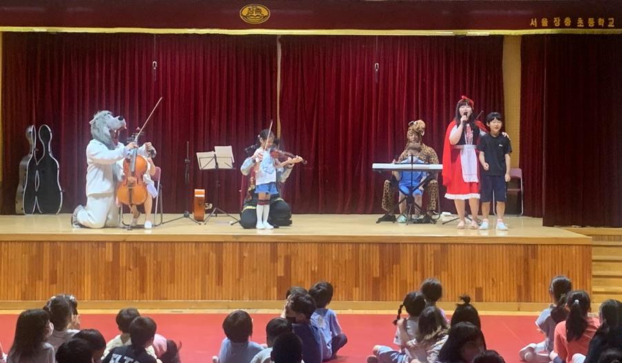 장충초등학교(교장노영문)는 7월 3일(월) ‘장충 예술의 날’ 행사를 주최하였습니다. 본교 강당에서 피아노 3중주(피아노, 바이올린, 첼로)로 1-3학년은 ‘빨간모자’를 주제로 한 클래식 음악극을 4-6학년은 클래식 음악회를 관람하였습니다.