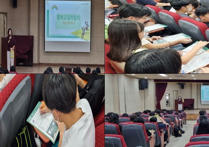 서울석촌초등학교(교장 강현숙) 6학년 학생들은 9월 5일(화)에 송파구 진로 진학 꿈나들이 - 진학설명회 ‘중학교 길라잡이’ 수업에 참여하였습니다. 초등학교 6학년 전환기 기간 중 막연한 중학교 진학에 대한 궁금증을 해소하고 중학생 생활에 대한 기대를 충족할 수 있는 소중한 시간이었습니다.