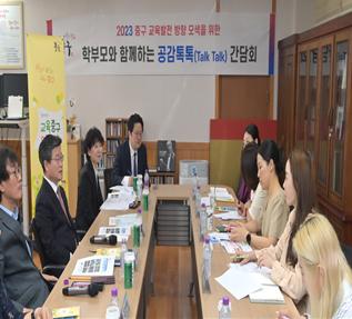서울장충초등학교(교장 노영문)에서는 5월 24일(목)에 중구청 구청장님과 본교 학부모님과 ‘학부모와 함께하는 공감톡톡(Talk Talk) 간담회를 갖었습니다. 먼저 교장선생님과 중구청 000구청장님의 인사말로 시작되었습니다. 중구청의 중점 교육사업에 대한 설명을 듣고 본교 학부모님들이 생각하는 학교의 시설 및 교육의 개선 방안과 중구청에서 도와주실 부분에 대한 이야기들을 나누었습니다.