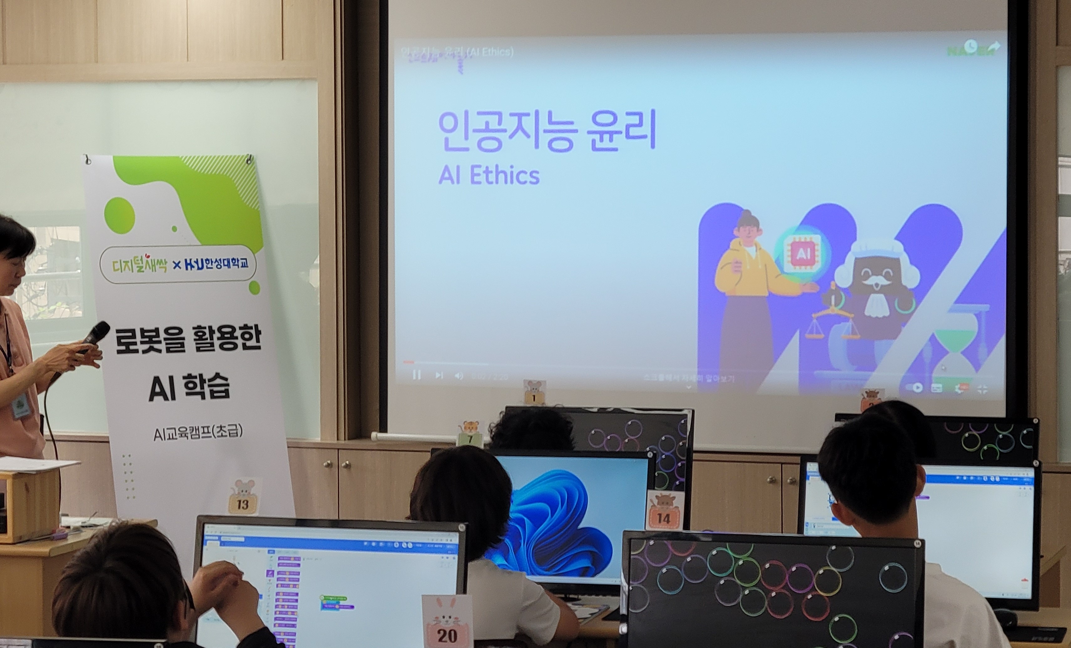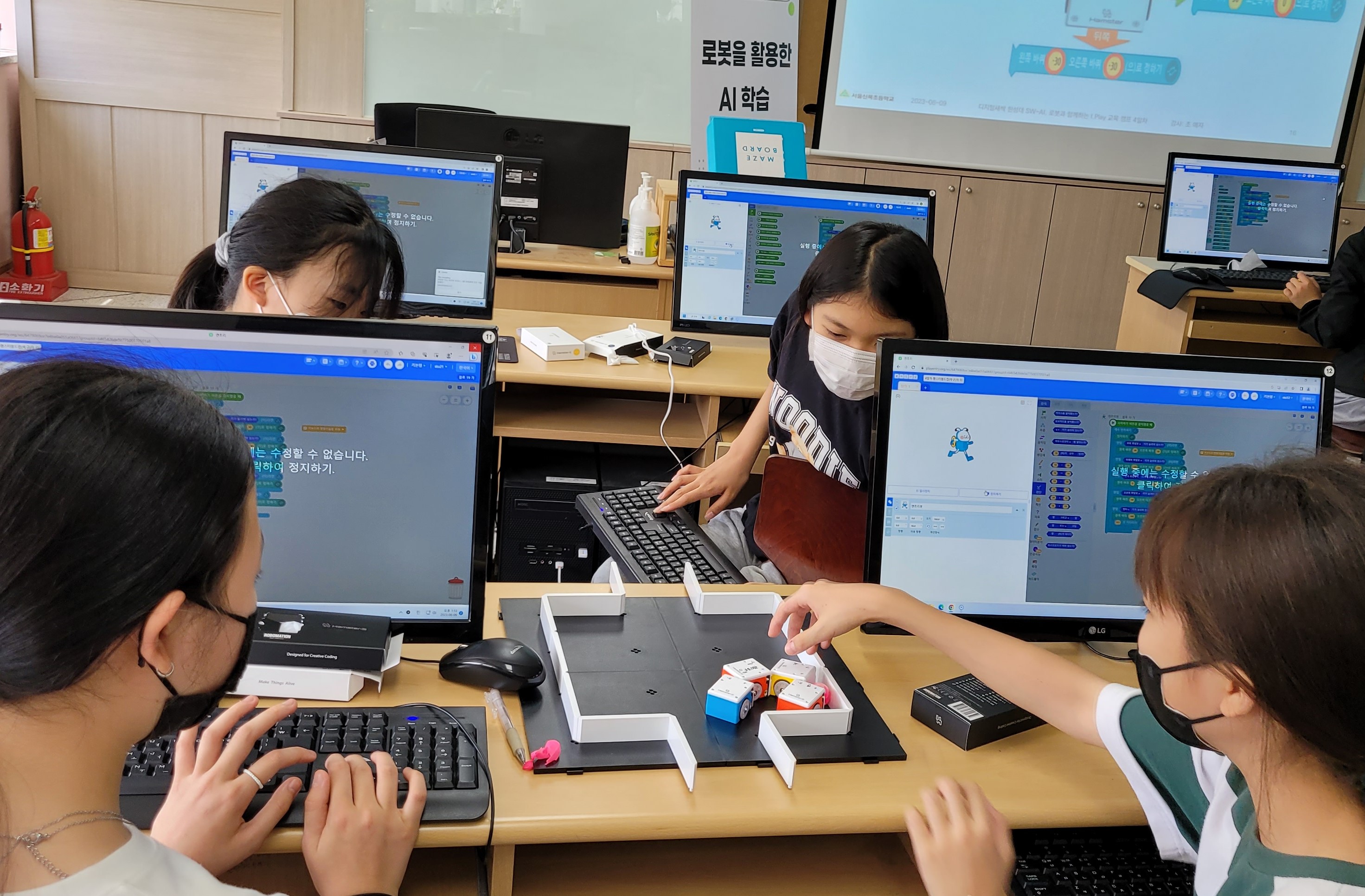 서울신묵초등학교(학교장 김용석)에서는 우리 학교 6학년을 대상으로 한국과학창의재단이 지원하고 한성대학교 창의융합교육지원센터가 협력하는 '디지털 새싹 캠프(2023. 5. 19. 6. 9. 주 1회 2시간)' 프로그램을 4주간 진행하였습니다. 민 관 학이 협력하여 디지털 교육의 새로운 모델을 만들어 간다는 의미의 '디지털 새싹 캠프'는 AI교육 선도학교가 아닌 우리 학교의 학생들에게 디지털 교육의 격차를 완화하고 인공지능 리터러시 역량을 키우는 좋은 기회가 되었다. 학생들은 '로봇을 활용한 AI학습' 이라는 주제 아래, 인공지능의 발전 역사, 사물을 인식하는 AI, 햄스터 로봇을 활용한 축구 등