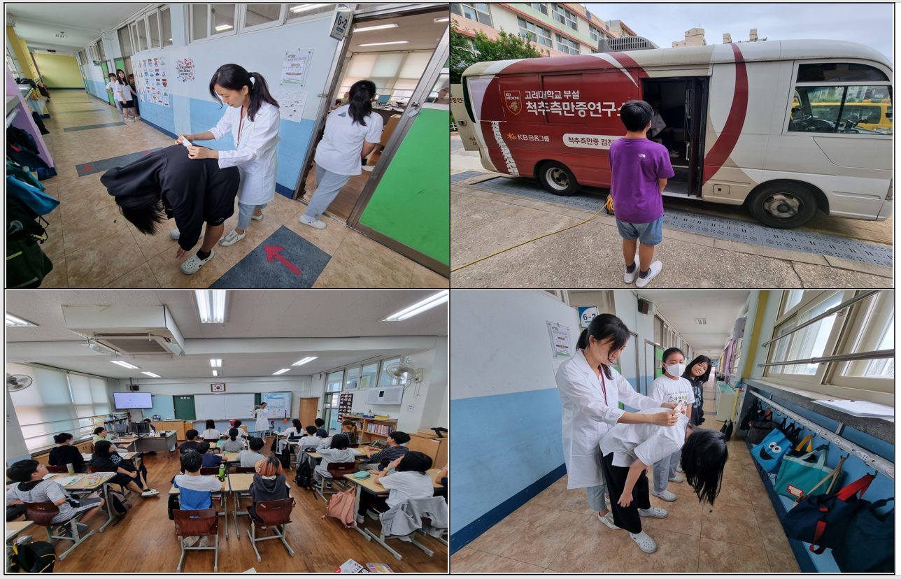 □ 이번 검진은 고려대학교 척추측만증연구소 검진팀이 X-선 검진 차량을 동원하여 학교로 직접 찾아오는 출장검진 형태로 이루어졌습니다. 학생들은 등심대 측정기를 사용한 1차 검진을 받았고 1차 검진 결과, 5도 이상의 휘어짐이 확인되면 경추부터 골반까지의 방사선 촬영 검사(2차 검진)를 실시하였습니다. 이번 척추측만증 검사가 척추 변형의 조기 발견 및 치료에 도움이 되기를 바랍니다.