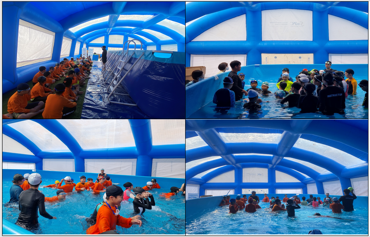 □ 서울마천초등학교(교장 박유신)는 9월 14일(목)~ 9월 26일(화), 9일간 본교 운동장에서 3, 4학년 학생들을 대상으로 『생존수영 교육』을 실시하였습니다. 이번 교육은 수영교육시설을 임대하여 운영하였고 임대업체를 통해 운동장에 에어돔 텐트 및 차단 펜스를 설치, 텐트 내부에 탈의실, 샤워장, 수영장 등의 수영 교육을 위한 시설을 마련하여 진행하였습니다. 수영장 수질 관리는 여과기, 살균소독제, 응집제 등을 활용하여 1일 1회 진행하였으며 적정 수온을 유지하도록 하여 학생들의 수영 교육에 차질이 없도록 하였습니다. 또한 탈의실 및 샤워실 앞에서 철저한 안전교육을 실시하였고 안전요원의 지도하에 입・퇴장이 이루어지도록 하였습니다.
