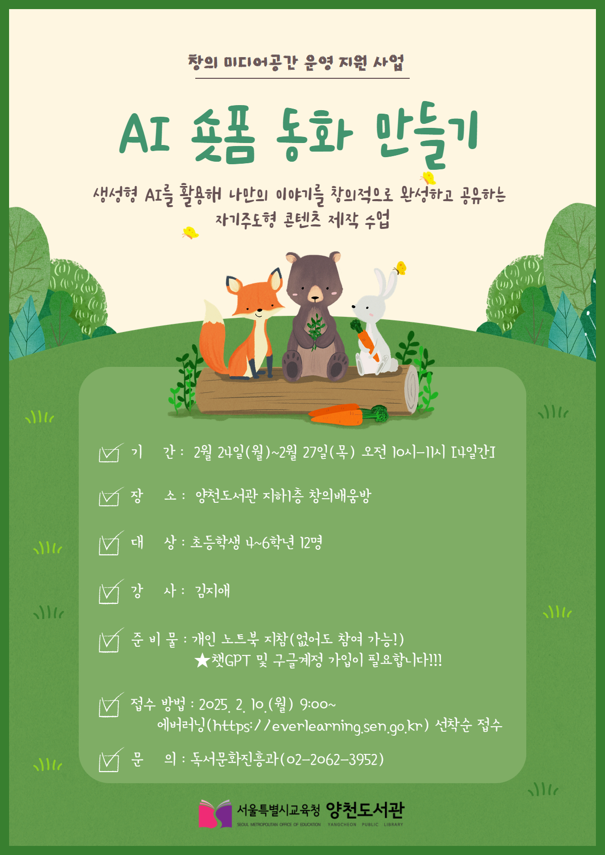 ▢ 서울특별시교육청 양천도서관(관장 김영학)은 초등학생 4~6학년을 대상으로 「AI 숏폼 동화 만들기」 강의를 운영한다.