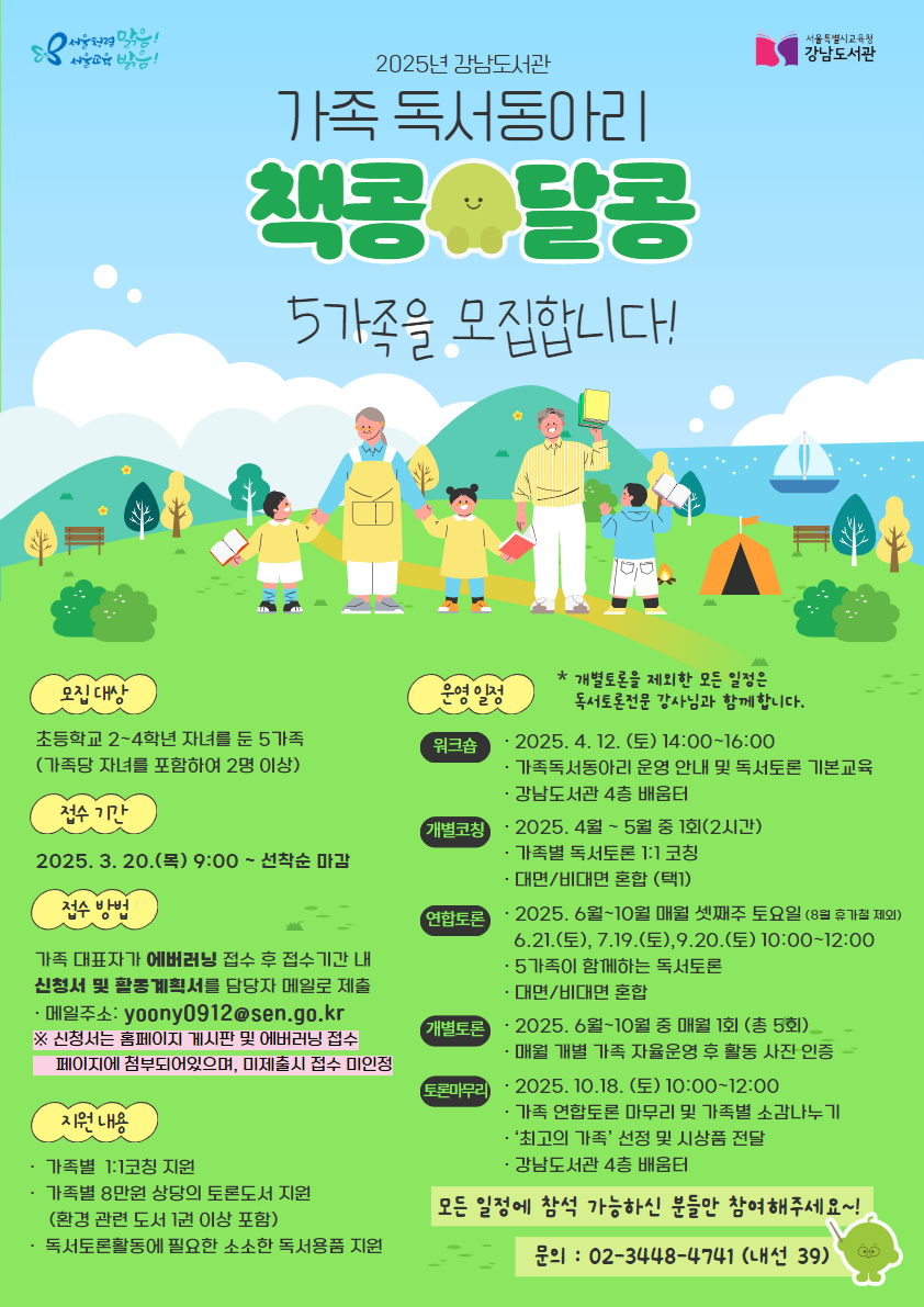 ▢ 서울특별시교육청(교육감 정근식) 강남도서관(관장 노귀례)은 오는 3월 20일부터 가족 독서동아리 「책콩달콩」 참여가족을 모집한다.