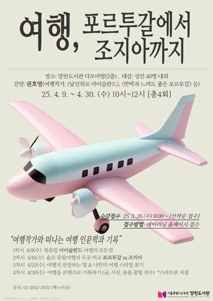 ▢ 서울특별시교육청 양천도서관(관장 김영학)에서는 2025년 4월 9일 ~ 4월 30일까지 총 4회차에 걸쳐 특화자료(여행,관광)프로그램 「여행, 포르투갈에서 조지아까지」를 운영한다.