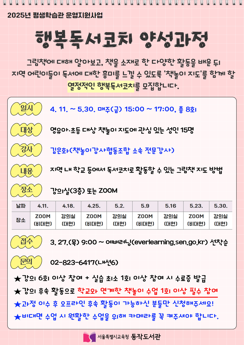 ▢ 서울특별시교육청동작도서관(관장 이연미)은 2025년 4월 11일(금)부터 5월 30일(금)까지 매주 금요일 오후 3시부터 5시까지 총 8회에 걸쳐 「행복독서코치 양성과정」 프로그램을 운영한다.