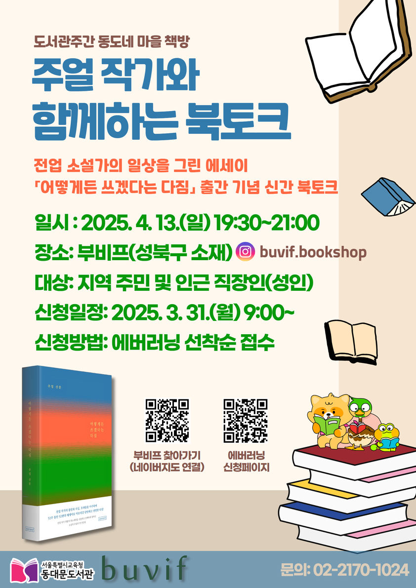 ▢ 서울특별시교육청(교육감 정근식) 산하 동대문도서관(관장 백정규)은 도서관주간(4월 12일~4월 18일) 기간 동네책방 부비프(buvif)와 함께「주얼 작가와 함께하는 북토크」 를 운영한다.
