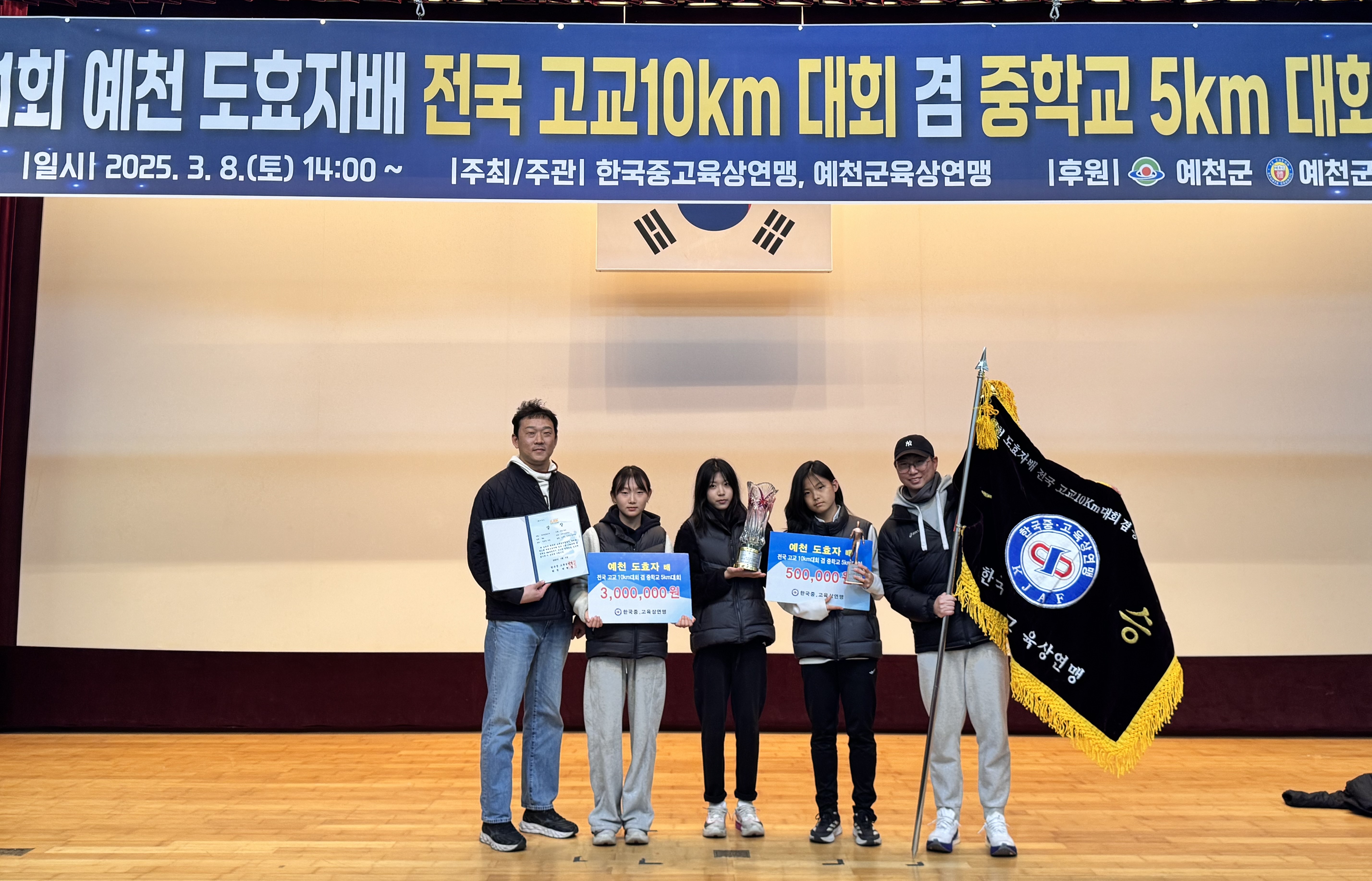 서울특별시 강서양천교육지원청 관내 신정여자중학교(교장 조허제) 육상부는 지난 3월 8일 경상북도 예천군에서 한국중고육상연맹 주최로 열린 제11회 예천 도효자배 전국중학교 5km 대회에 1.2.3학년 각 1명씩 총 3명의 선수가 출전하여 여중부 단체전에서 우승을 차지하였습니다.