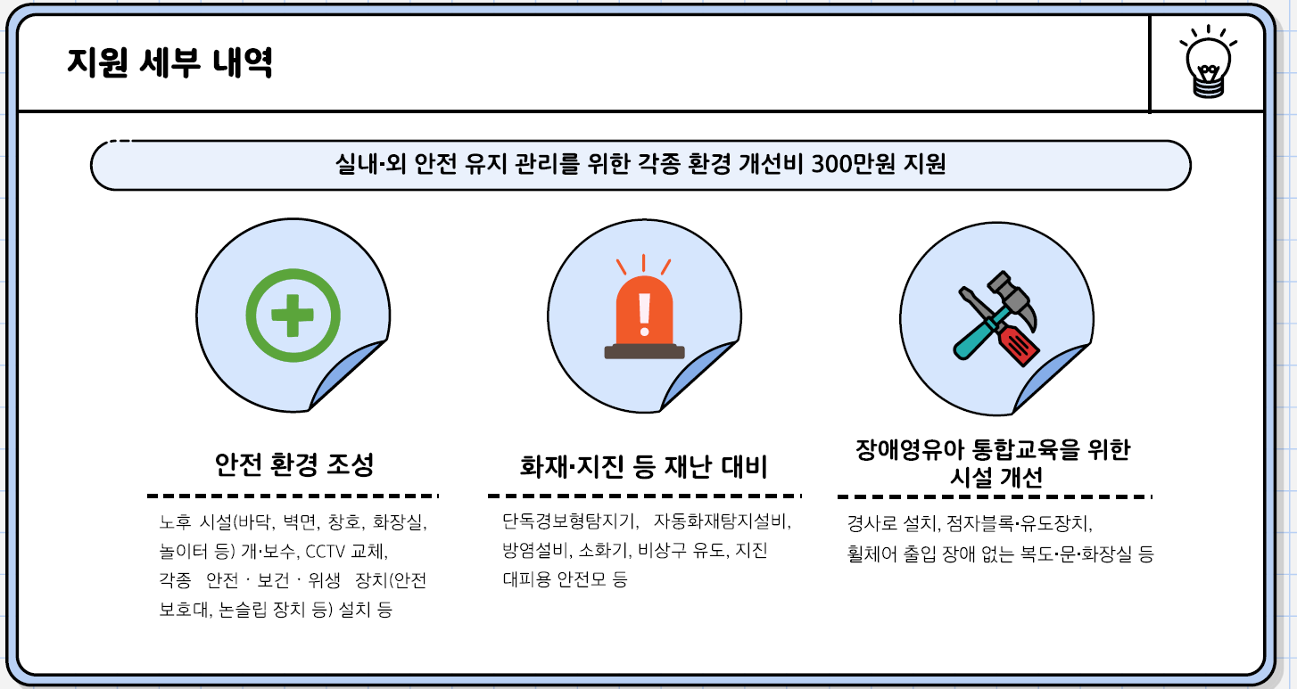 ▢ 올해 선정된 유치원 및 어린이집에는 기관당 300만 원을 지원한다. 예산은 노후 바닥재 교체, 안전 울타리 설치 등 안전 환경 조성, 화재·지진 등 재난 대비 설비, 장애 영유아 통합교육을 위한 시설 개선 등 실내․외 안전 유지 관리에 사용된다.