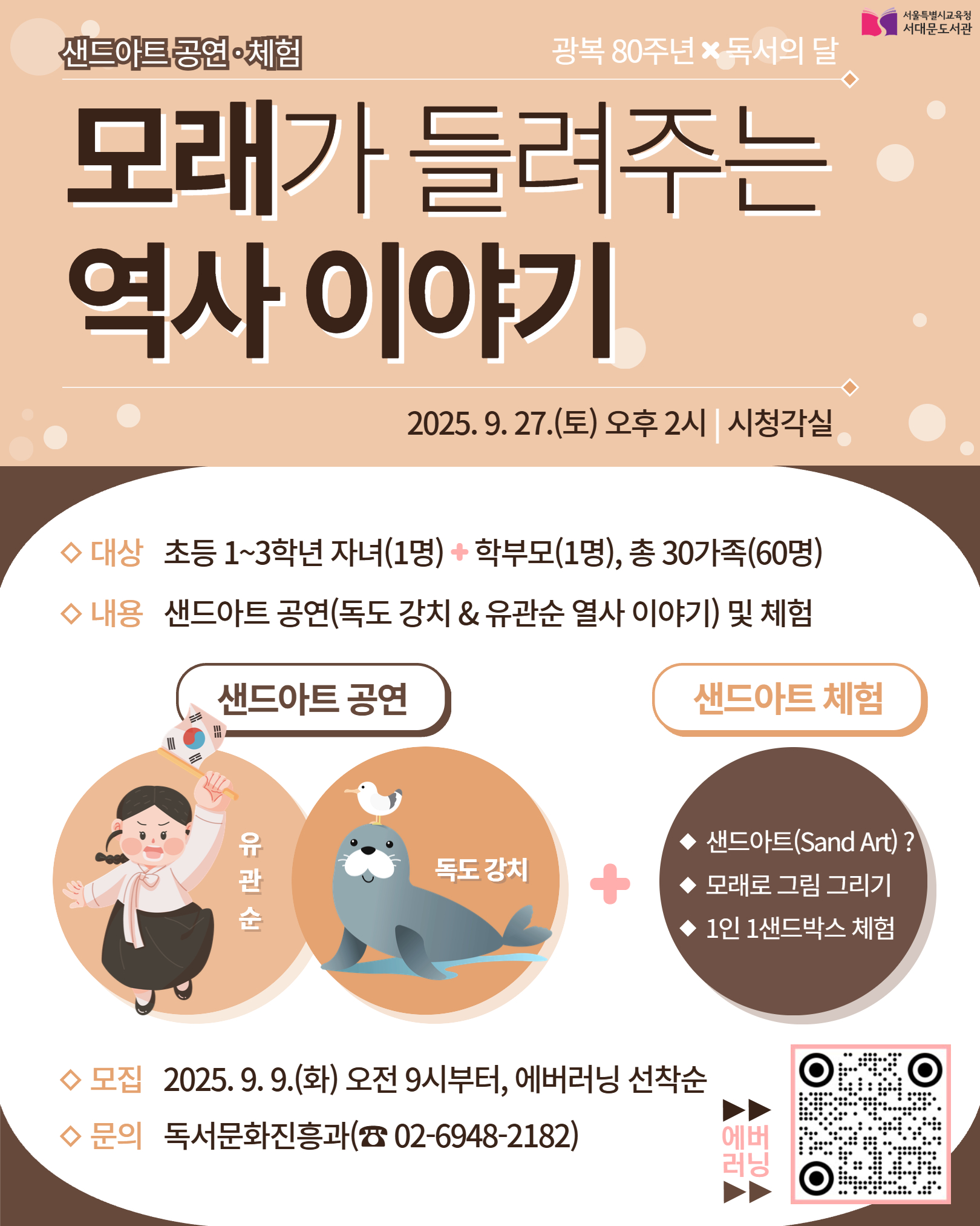 ▢ 서울특별시교육청(교육감 정근식) 서대문도서관(관장 노귀례)은 오는 9월 27일, 초등학생 자녀를 둔 가족을 대상으로 「모래가 들려주는 역사 이야기」 프로그램을 운영한다.