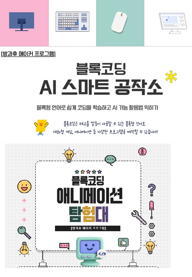 ▢ 서울특별시교육청(교육감 정근식) 산하 어린이도서관(관장 김진승)은 방과후 메이커 프로그램으로 『블록코딩 AI 스마트 공작소』와 『블록코딩 애니메이션 탐험대』를 운영한다.