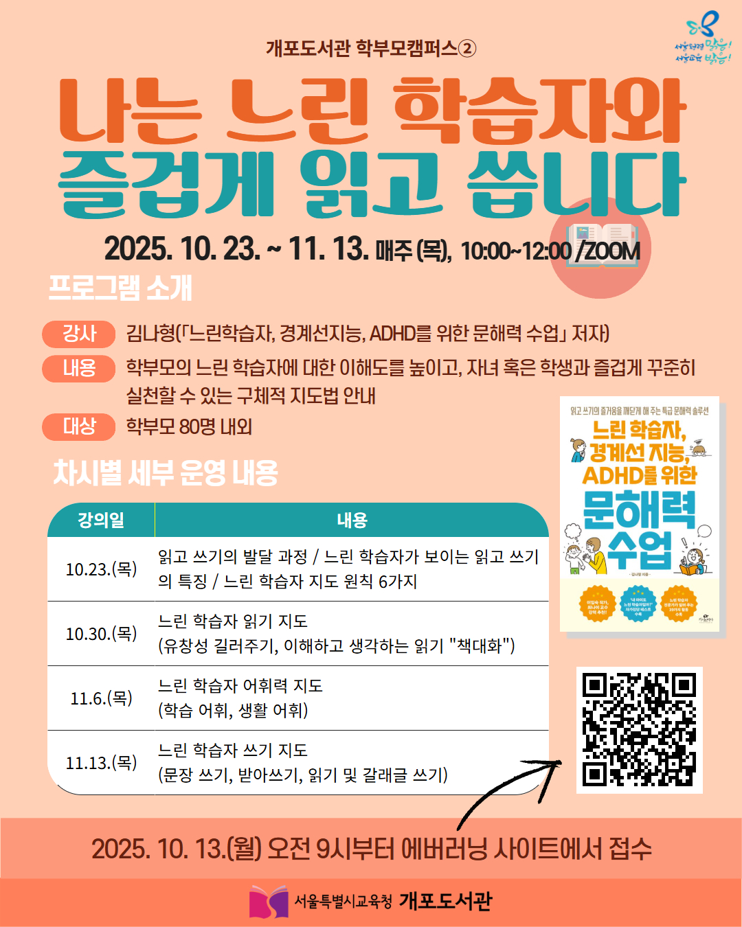 ▢ 서울특별시교육청(교육감 정근식) 소속 개포도서관(관장 이용미)이 ‘2025년 학부모캠퍼스 프로그램’으로 「나는 느린 학습자와 즐겁게 읽고 씁니다」 프로그램을 10월 23일 목요일 오전 10시부터 12시까지 실시간 온라인 비대면(ZOOM 활용)으로 진행한다.