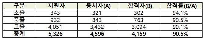 ▢ 한편, 금년도 2회 검정고시는 4,596명이 응시하여 4,159명이 합격하였으며 합격률은 90.5%를 보였다.
