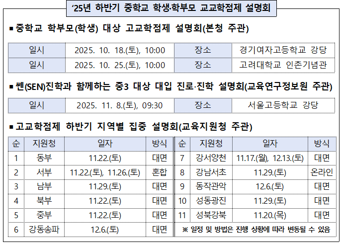 ▢ 서울시교육청(교육감 정근식)은 고교학점제에 대한 이해도를 높이고 학생들의 진로·학업 설계를 돕기 위하여, 2025학년도 중학교 학부모를 위한 고교학점제 설명회를 개최한다.