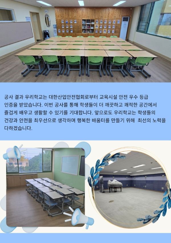공사결과 대한산업안전협회로부터 교육시설 안전우수 등급을 받았습니다.