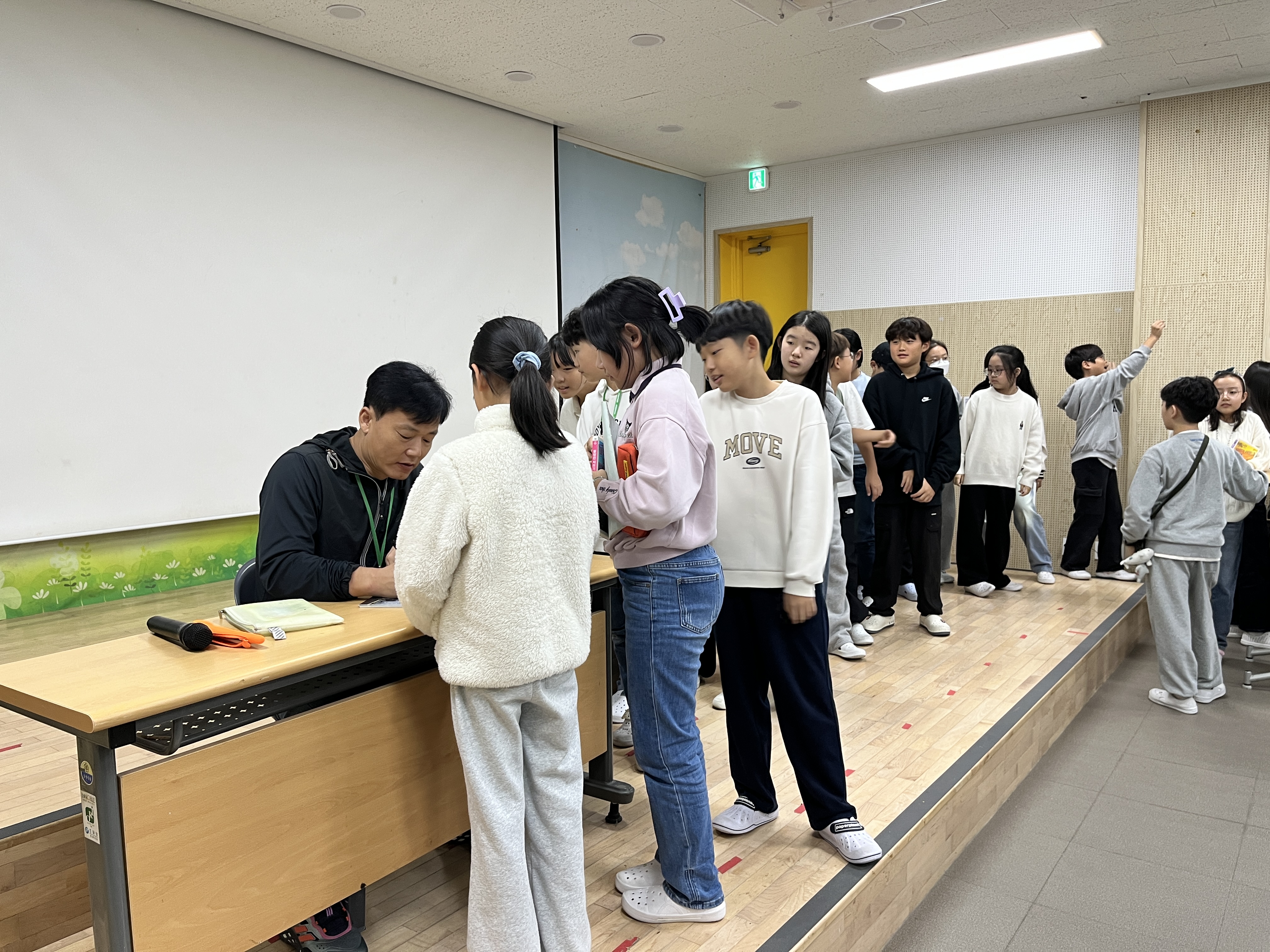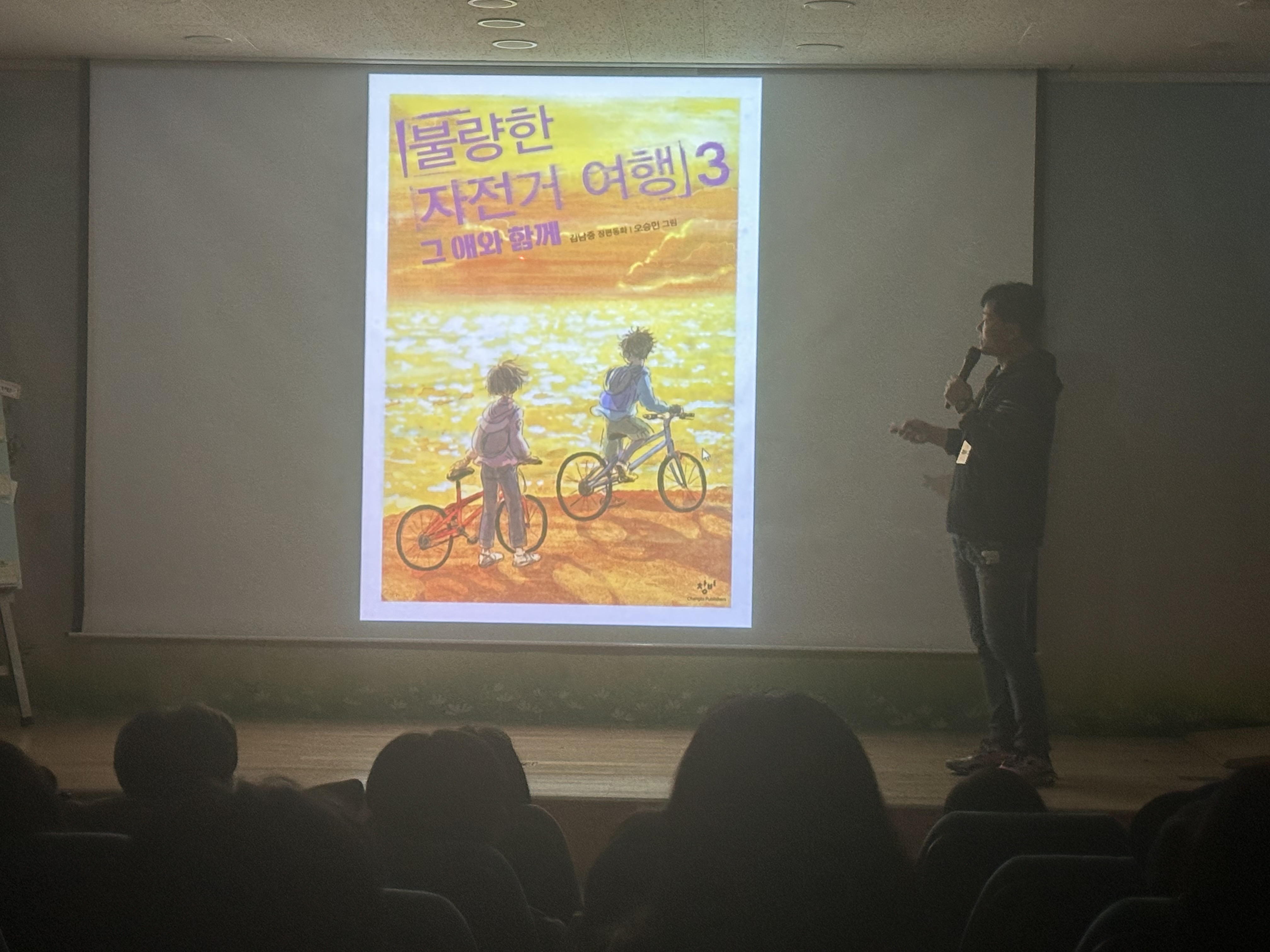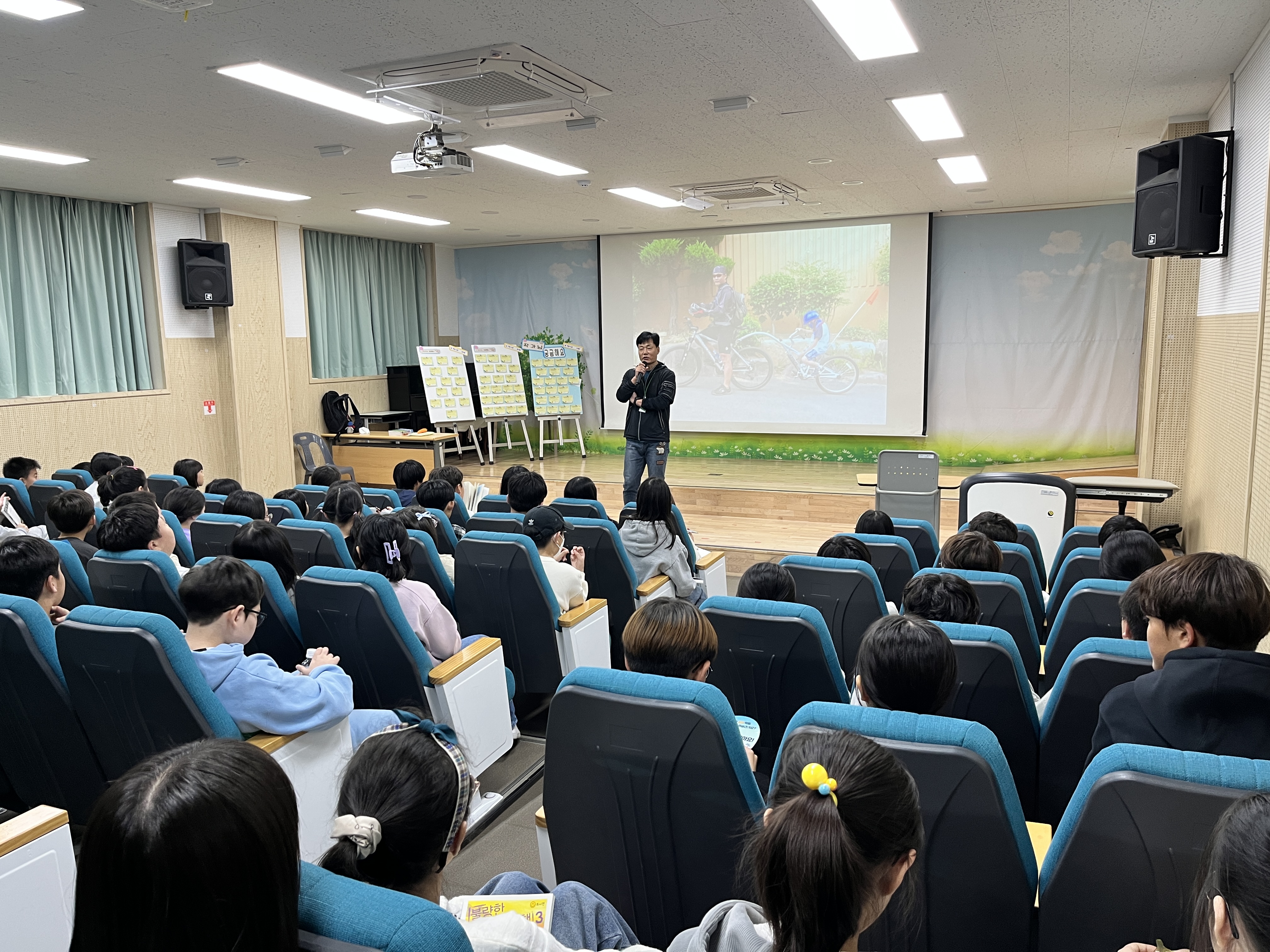 이번 행사는 5학년 추천 도서인 ‘불량한 자전거 여행’ 작품을 지은 김남중 작가의 강연을 듣고 학생들이 미리 준비한 질의 응답을 하는 시간으로 진행되었습니다. 김남중 작가님은 강연과 질의응답 시간을 통해 가족, 자전거, 여행 등을 주제로 이야기를 펼치시며, 어떻게 동화 작가가 되었고, 어떤 과정을 통해 동화를 쓰게 되는지 유쾌하게 설명해주셨습니다. 또한 김남중 작가의 대표작을 미리 읽어보고, 작가님의 책 또는 엽서에 직접 사인을 받으며 동화 작가라는 꿈에 대해 한 걸음 다가갈 수 있는 의미 있는 시간을 보냈습니다.