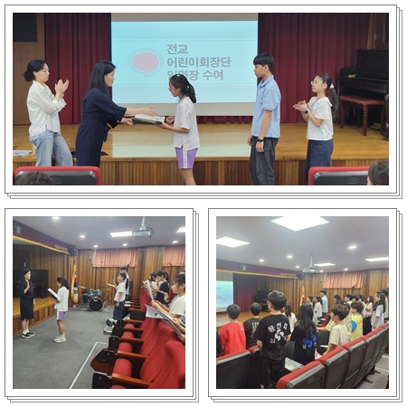 서울용두초등학교(교장 김명자)는 2025년 8월 29일(금)에 2학기 전교 임원과 3~6학년 학급 임원들을 대상으로 교내 임원 교육을 실시하였습니다. 교장선생님의 임명장 수여에 이어 임원으로 가져야 할 각오와 자세에 대한 다짐을 선서하고, 회의 진행 방법을 배우고 리더십 교육을 배웠습니다. 이번 교육을 통해 창의적인 생각으로 우리 학교를 꿈과 사랑으로 가득한 행복한 학교로 만들기 위해 한 학기 동안 임원으로서 맡은 바 최선을 다하기를 바랍니다.