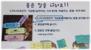 서울수명초등학교(교장 조성복)에서는 9월 17일(수), 18일(목) 이틀 동안 느티나무 큰잔치기념품에 어울리는 말을 쓰기가 진행되었습니다. 130여명의 학생이 정성 들여 쓴 말을 게시판에 붙이고 서로 읽어 보면서 마음이 따뜻해지는 경험을 하였습니다. 어떤 학생은 열 개나 되는 말을 썼고 4학년 5반의 한 학생은 지우개에게 전하는 말을 쓰기도 했습니다. 교장 선생님과 여러 선생님께서 많은 글 중에 느티나무 큰잔치 와 가장 어울리는 것으로 5학년 2반 학생이 쓴 글을 선택하고 조금 다듬어 “너의 소중한 도전, 응원할게!”를 기념품에 새기기로 하였습니다. 학교행사를 통하여 서로 마음을 나눌 수 있어서 좋았고 글을 쓴 모든 학생들에게 정말 감사한 마음이 들었습니다.